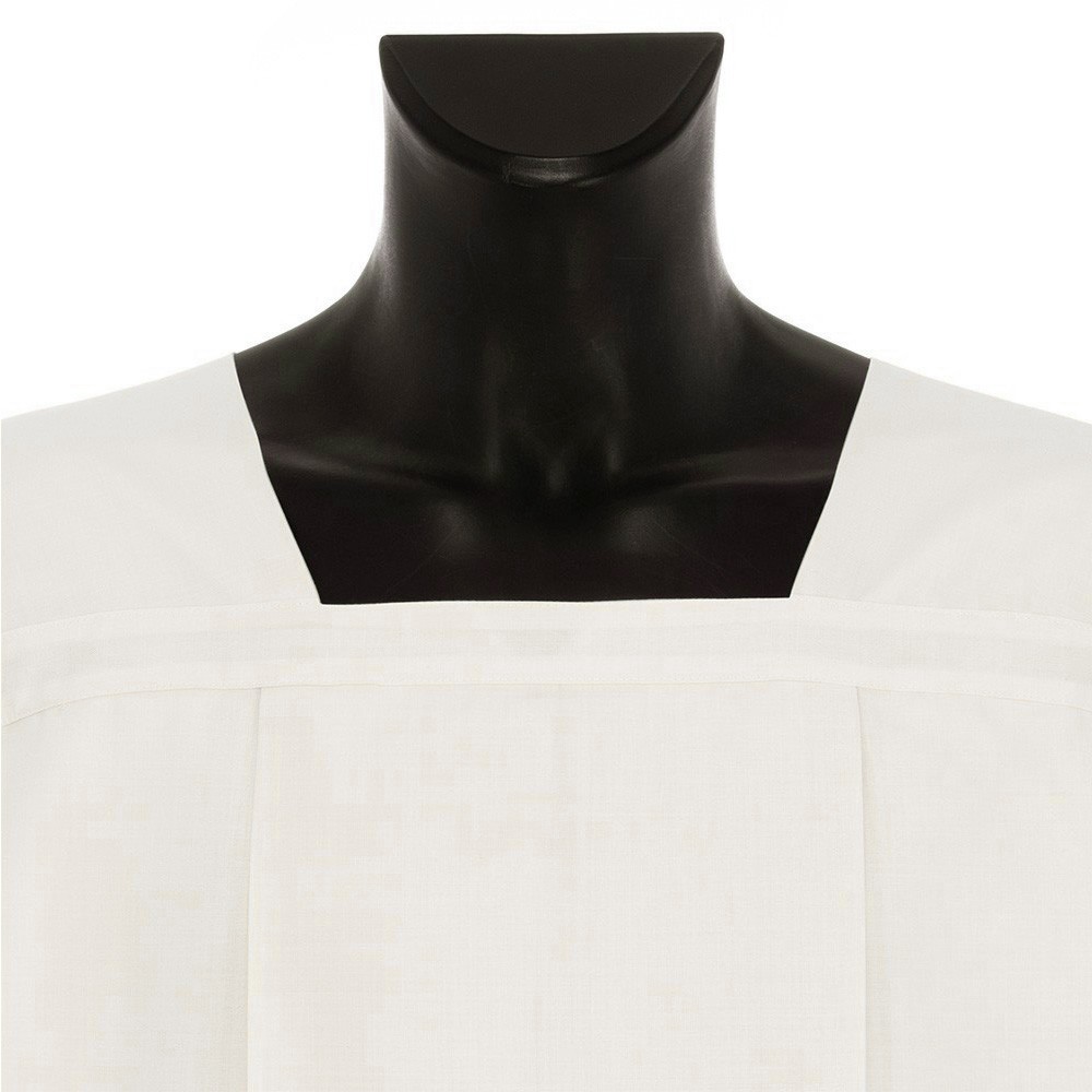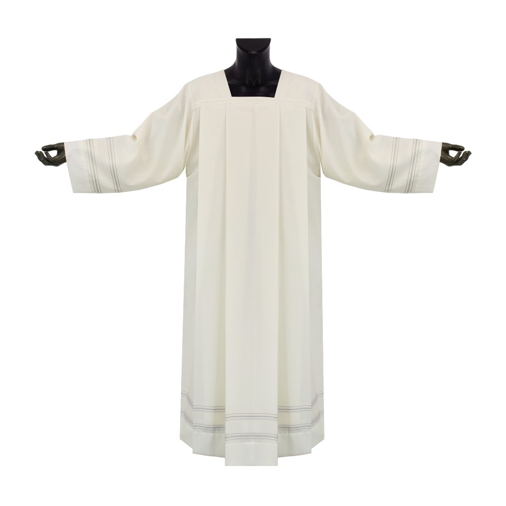 Elegant striped liturgical alb (size 150 cm) in ivory color, featuring pleats and a practical square neckline. This alb is made in Italy using high-quality fabrics, specifically designed to ensure comfort and durability over time.