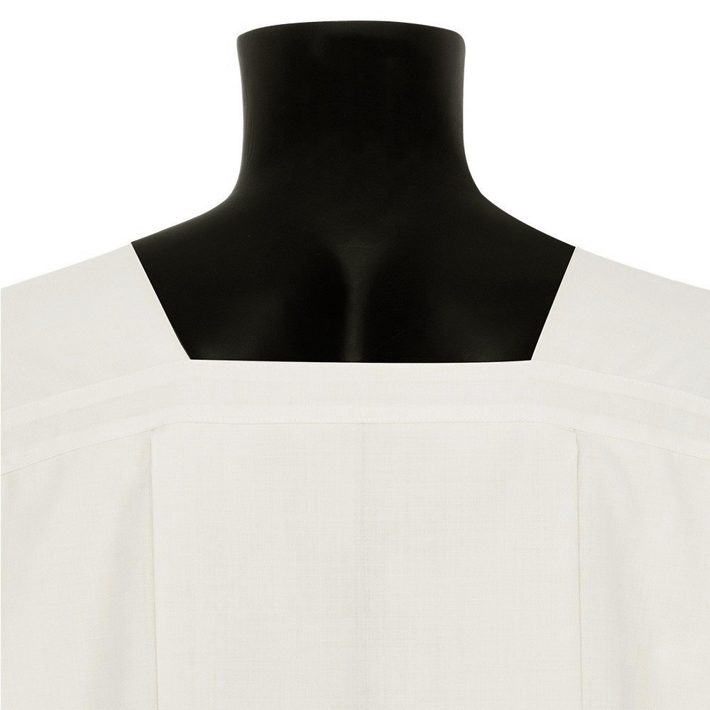 This fine liturgical alb is made from a blend of wool and polyester fabric.