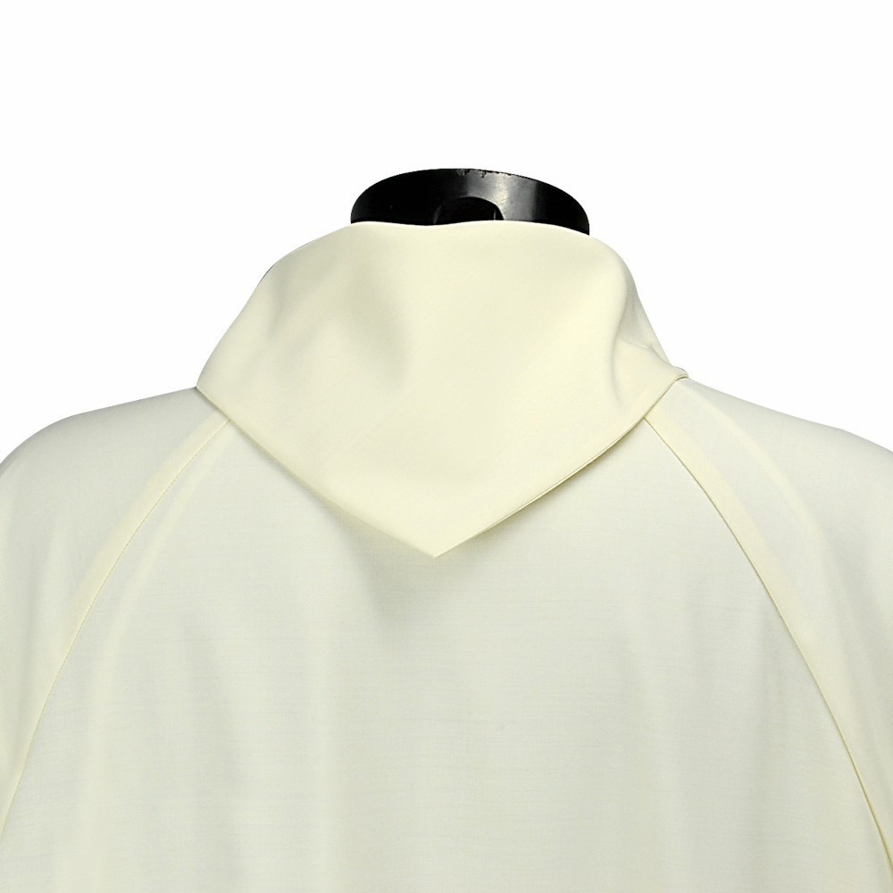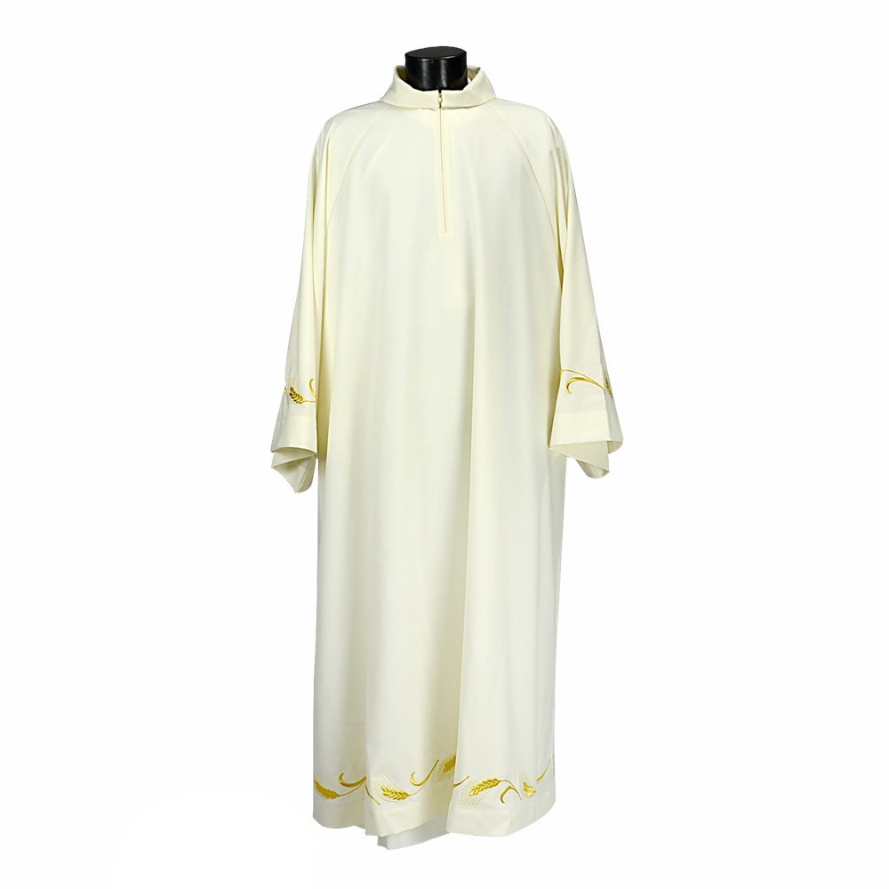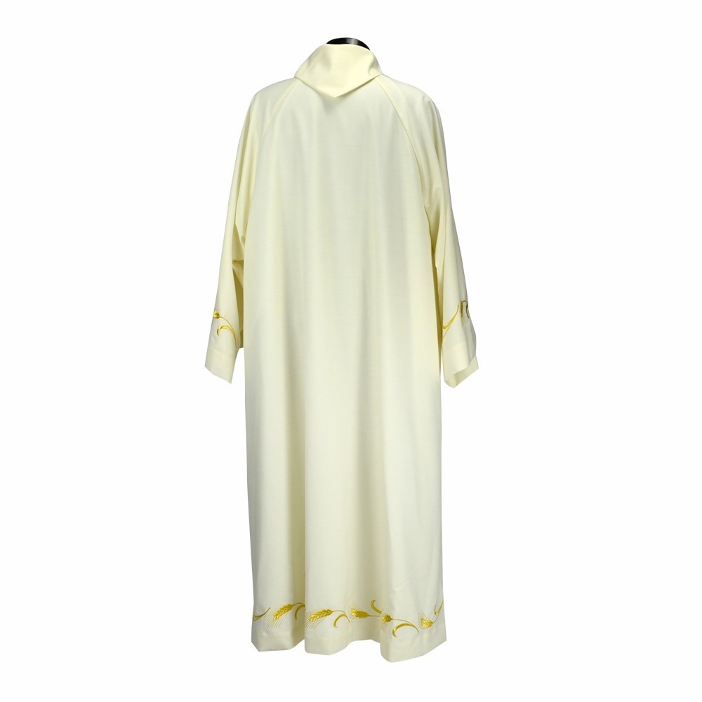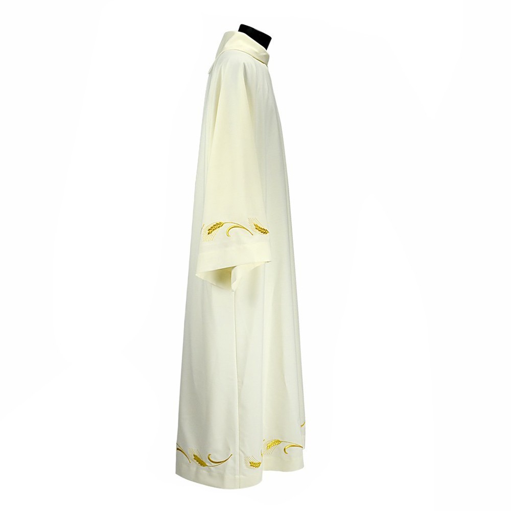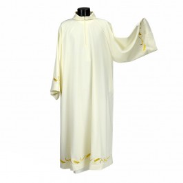Liturgical alb of ivory color in wool blend – 55% polyester and 45% wool. Very popular thanks to the central zipper and the fresh fabric. Delicate gold yarn embroidery around the sleeves and the lower circumference of the alb.