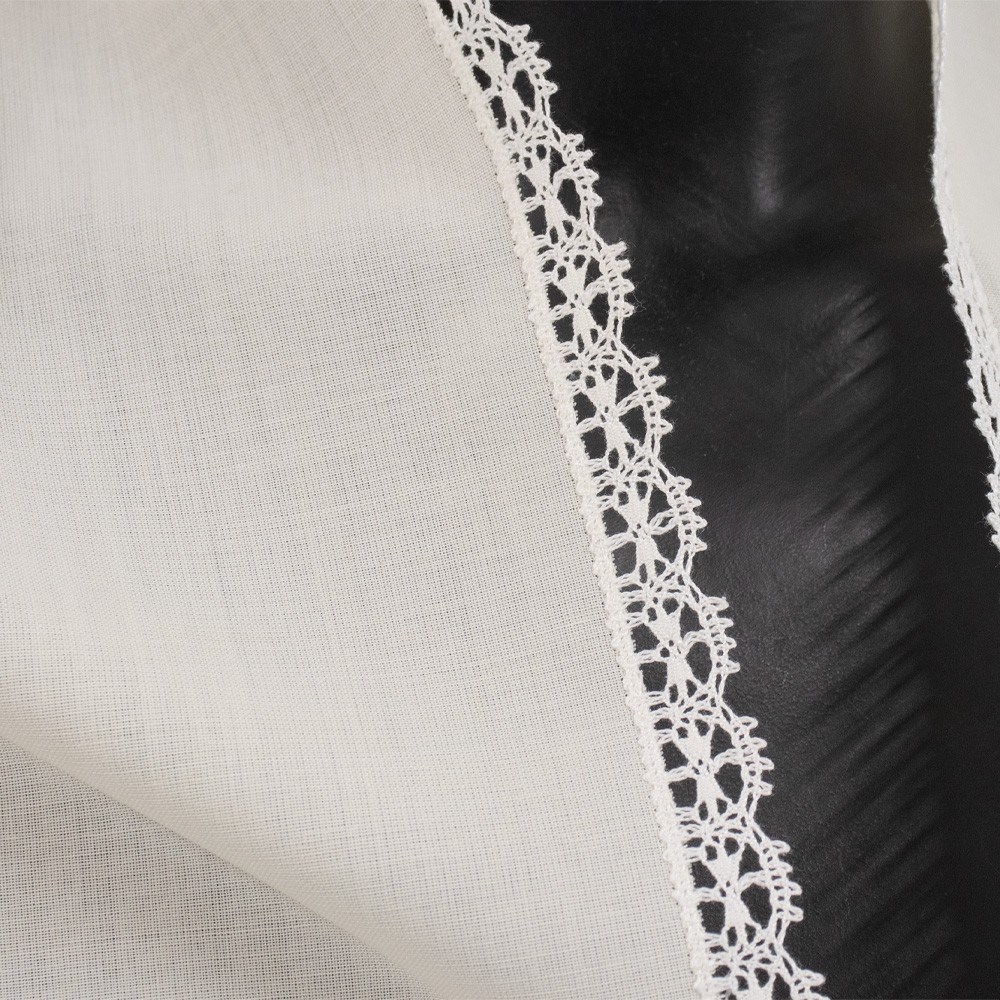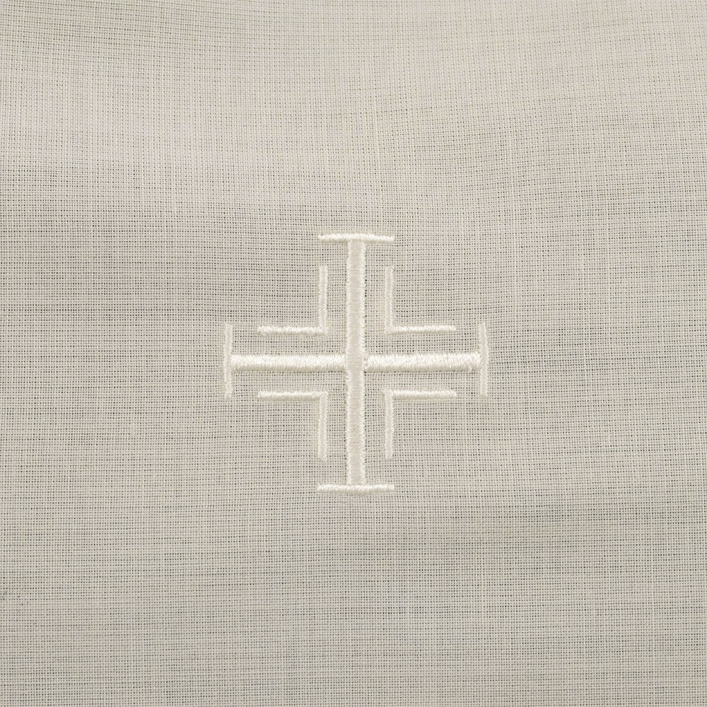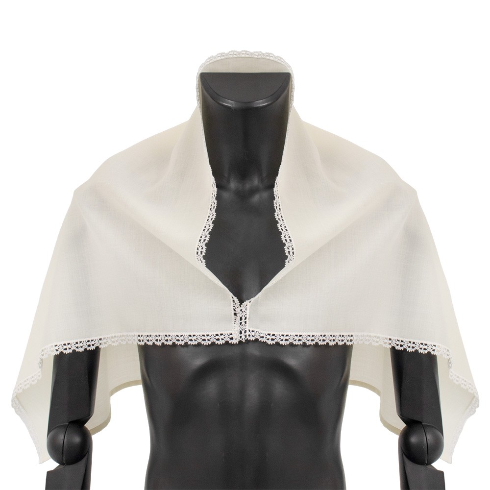 Ivory colored amice for priest, decorated with fine machine embroidery of a cross.