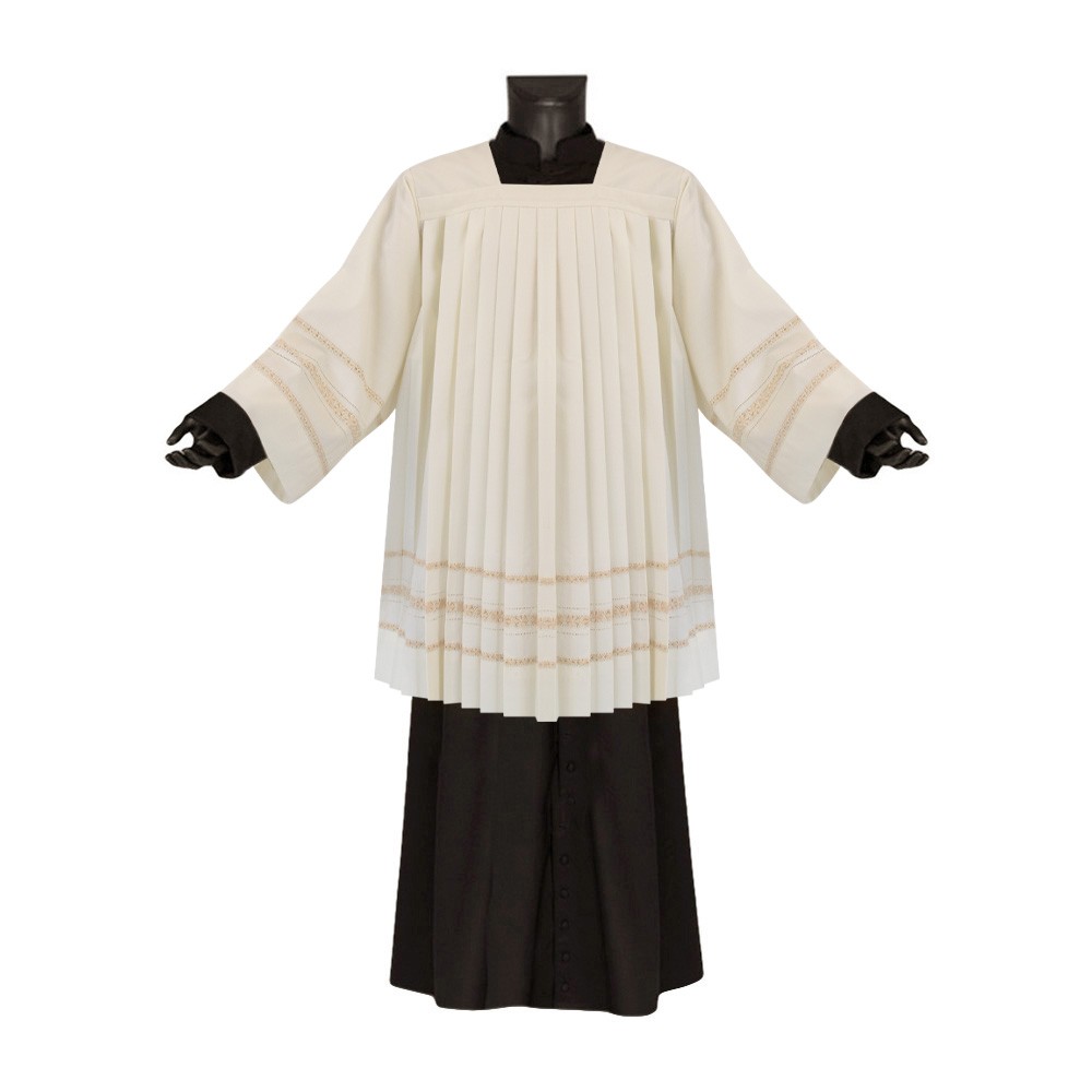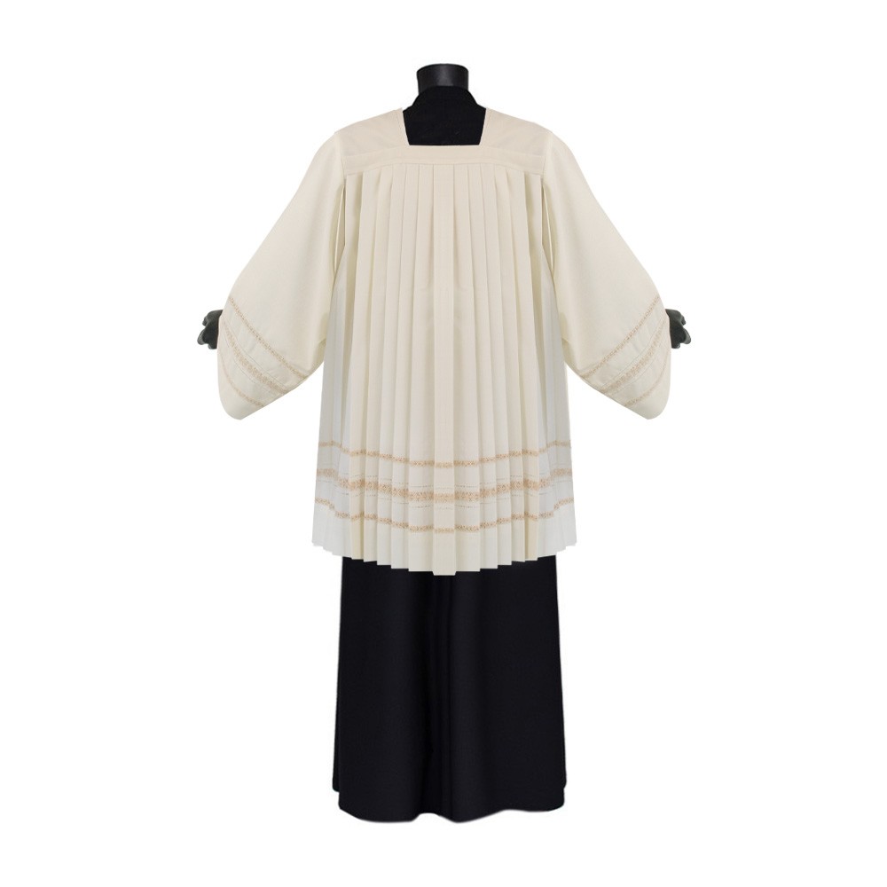This surplice is hand-embroidered on a wool and polyester blend fabric.