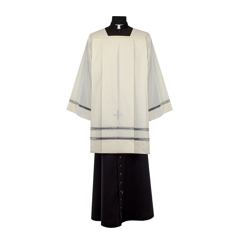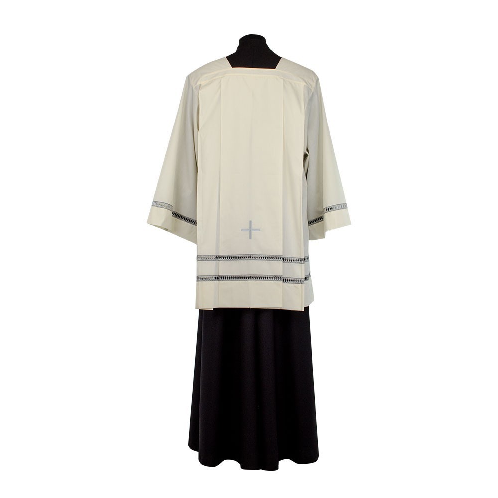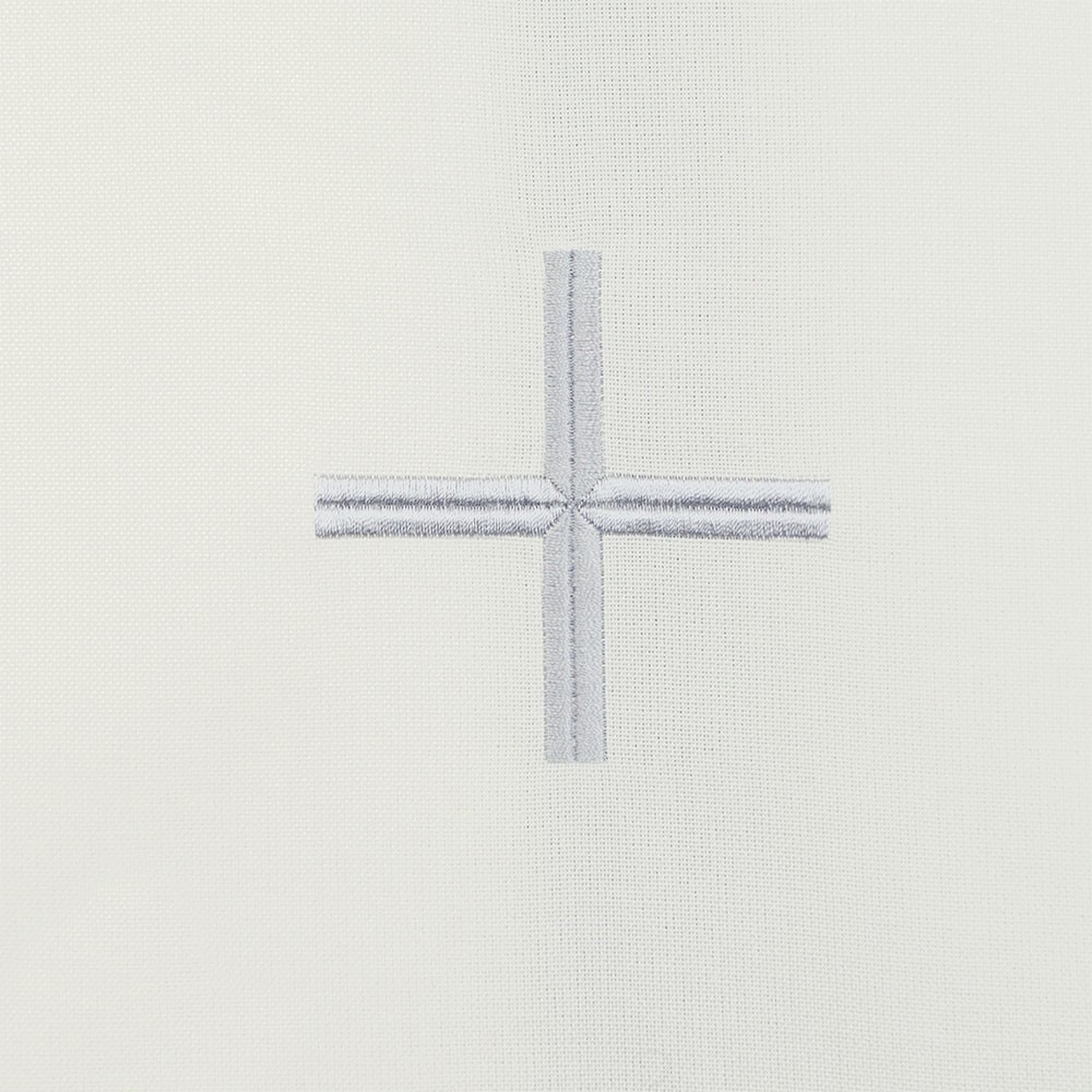Ivory surplice with cross and gigliuccio hemstitch embroidered by machine. Made of very light Terylene cotton. Two rows of gray embroidery are added on the bottom of the surplice, while the sleeves feature only one row of embroidery. Entirely made by an Italian company using excellent quality materials and fine manufacturing techniques.