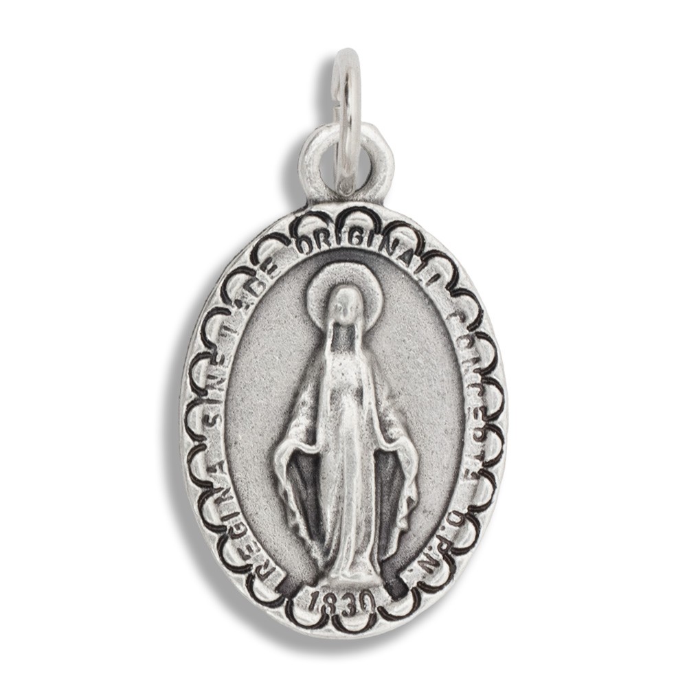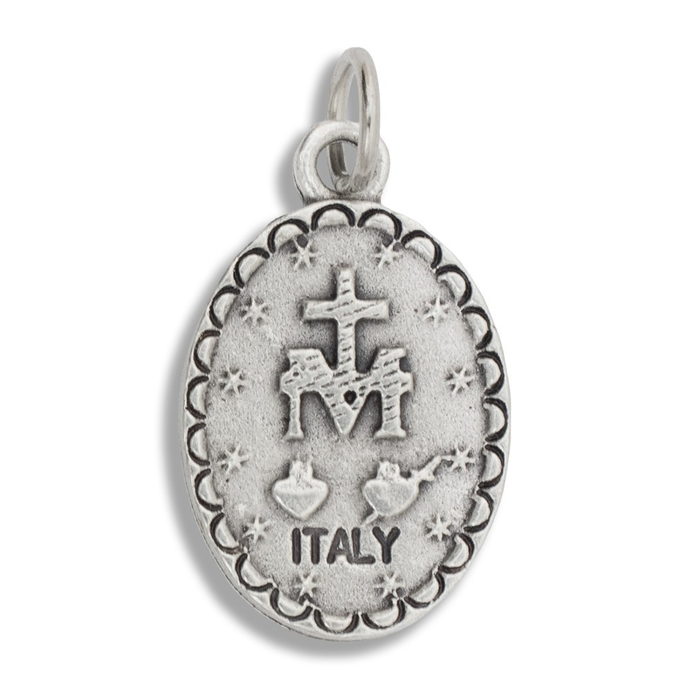 Miraculous Medal entirely made of metal. The medal is 1.7 cm tall and supplied with a ring that can be opened.