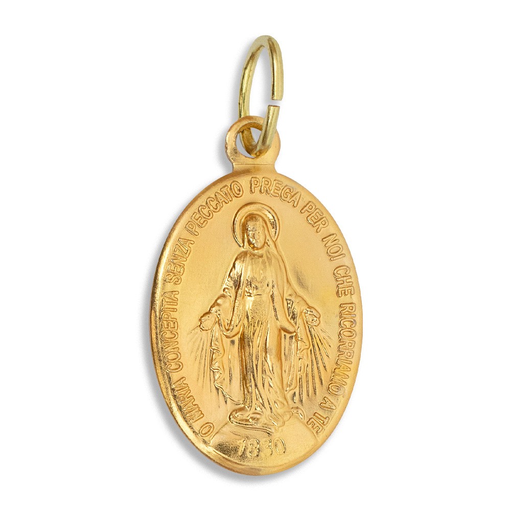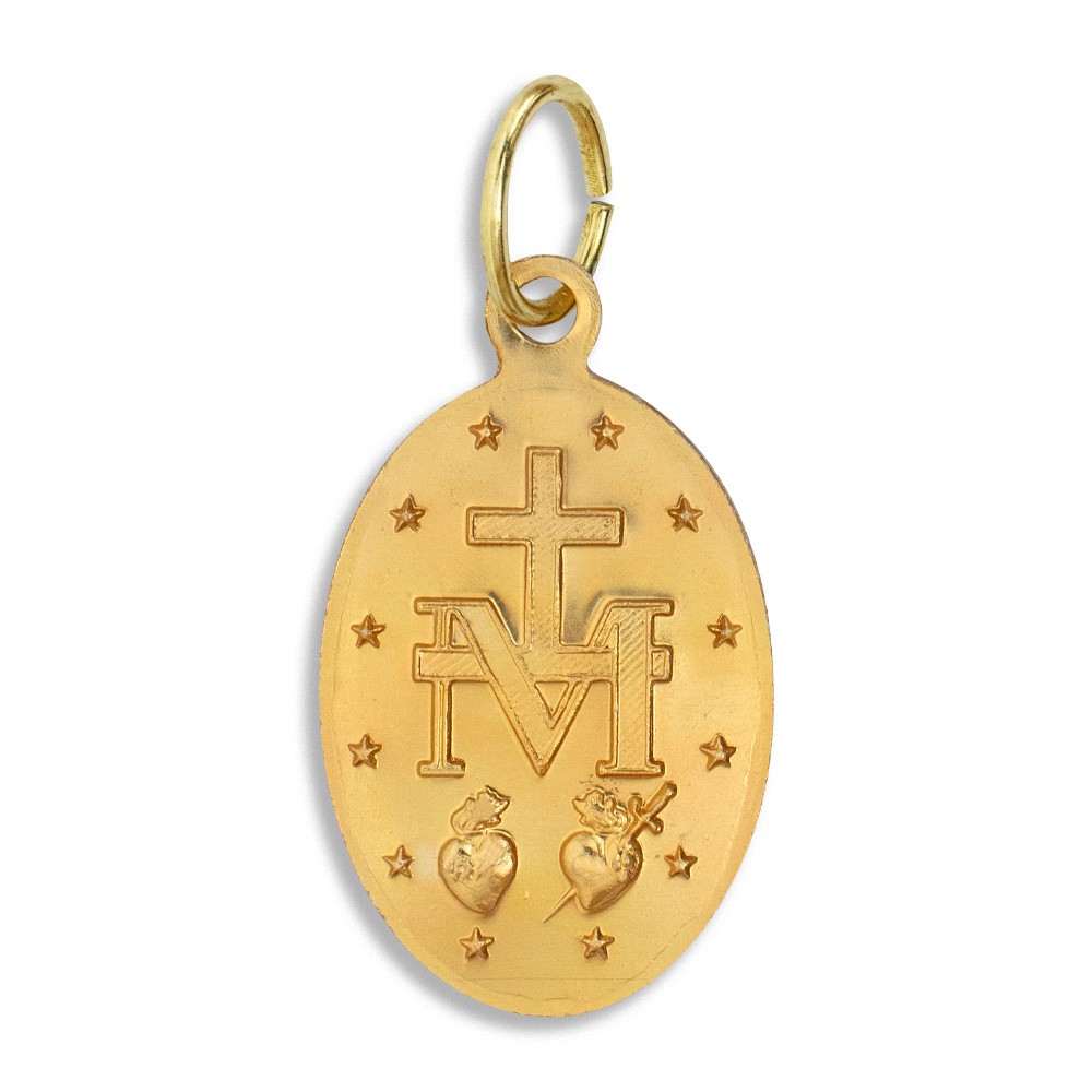 Miraculous Medal made of gold-finish metal with a small loop, approximately 2.2 cm high.