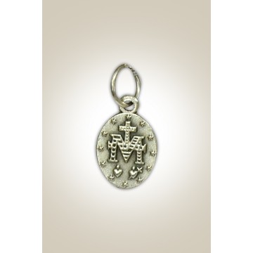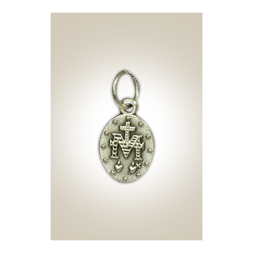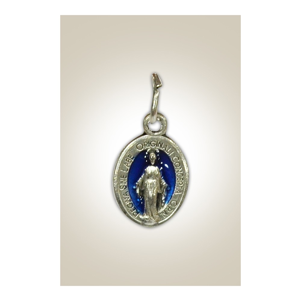 Medal of Our Lady Of Miracles in silver-plated zamak with blue enamel; height 1 cm. Made in Italy.