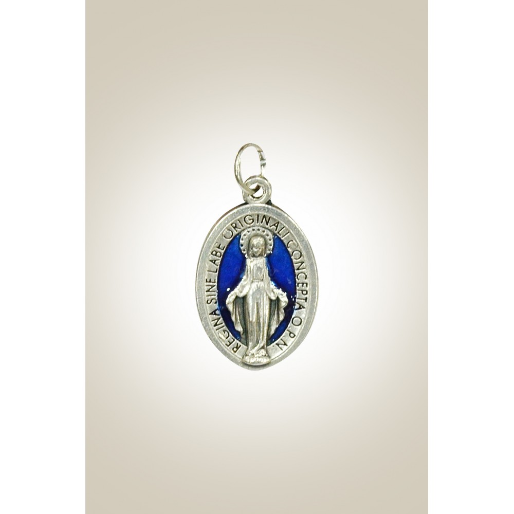 Medal of Our Lady Of Miracles, made of silver-plated zamak and blue enamel. The medal is oval shaped. Height: 2.2 cm. Made in Italy.