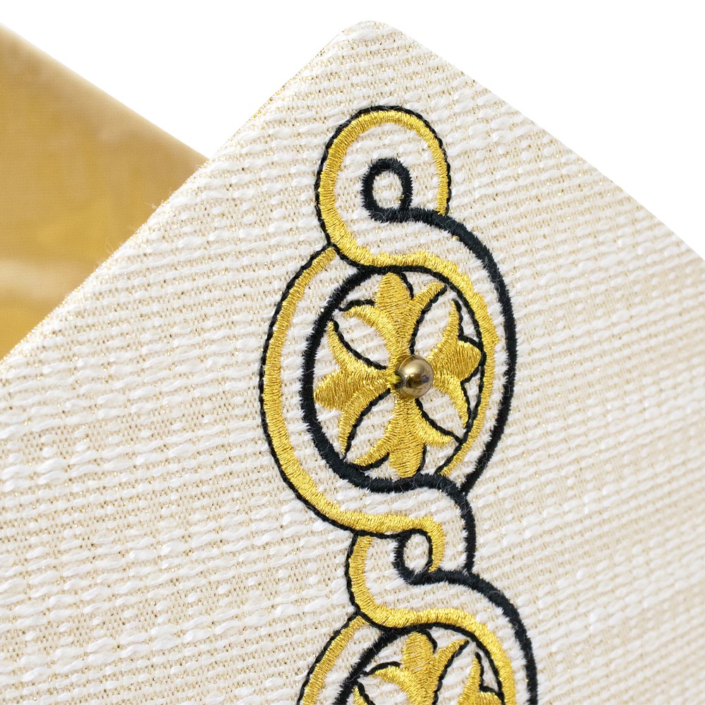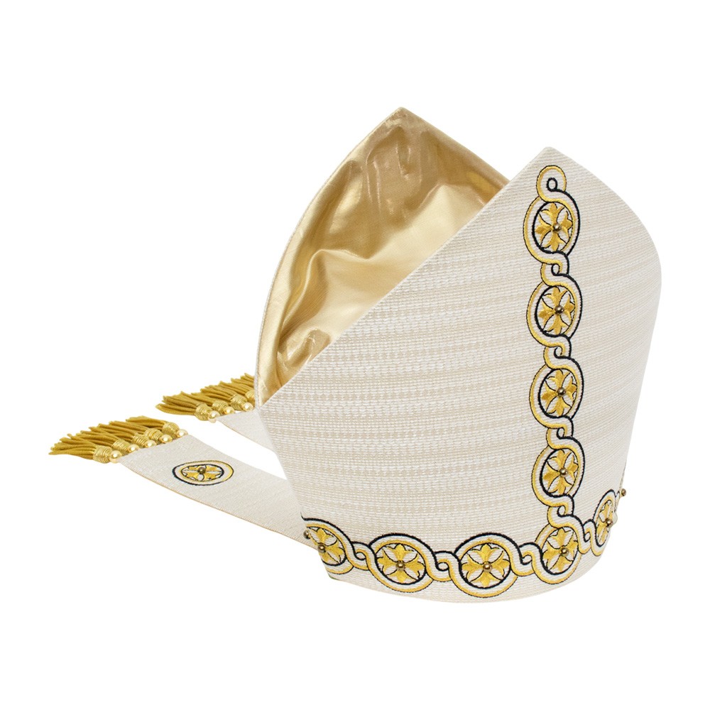 Ivory miter with gold embroidery and gold bullion fringe under the lappets. A top-quality sartorial product, 100% Made in Italy.