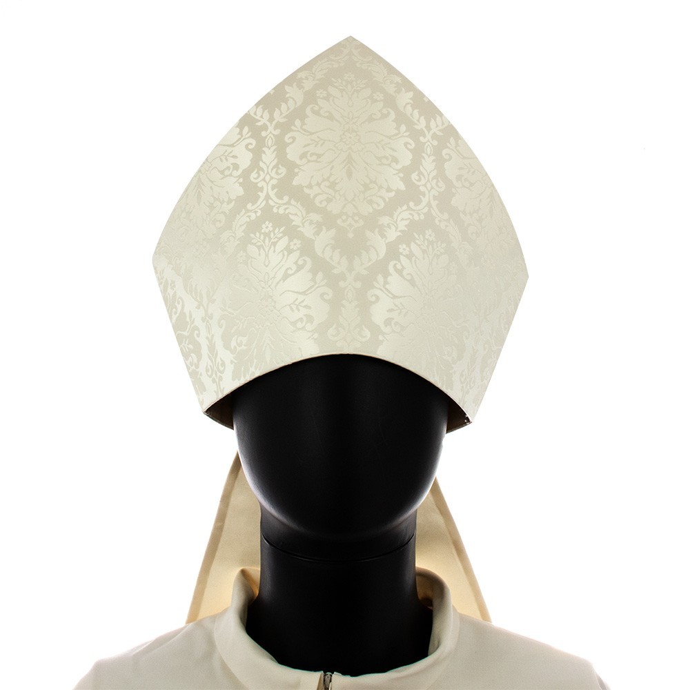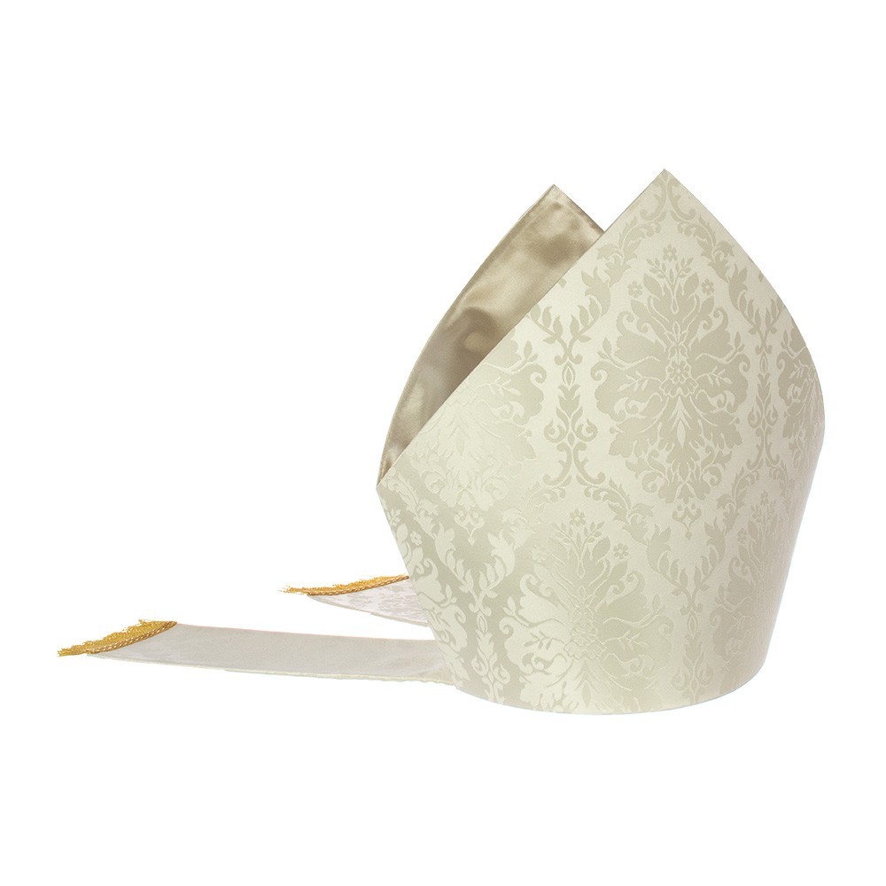 Ivory mitre in Damask fabric (100% acetate). Complete with fringe in gold thread. Height: 27 cm. Supplied with case and box.