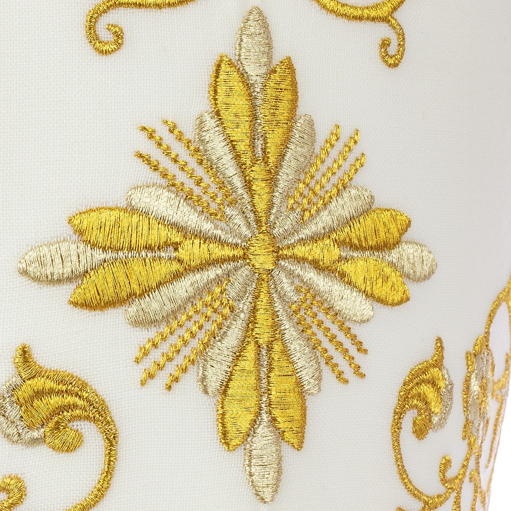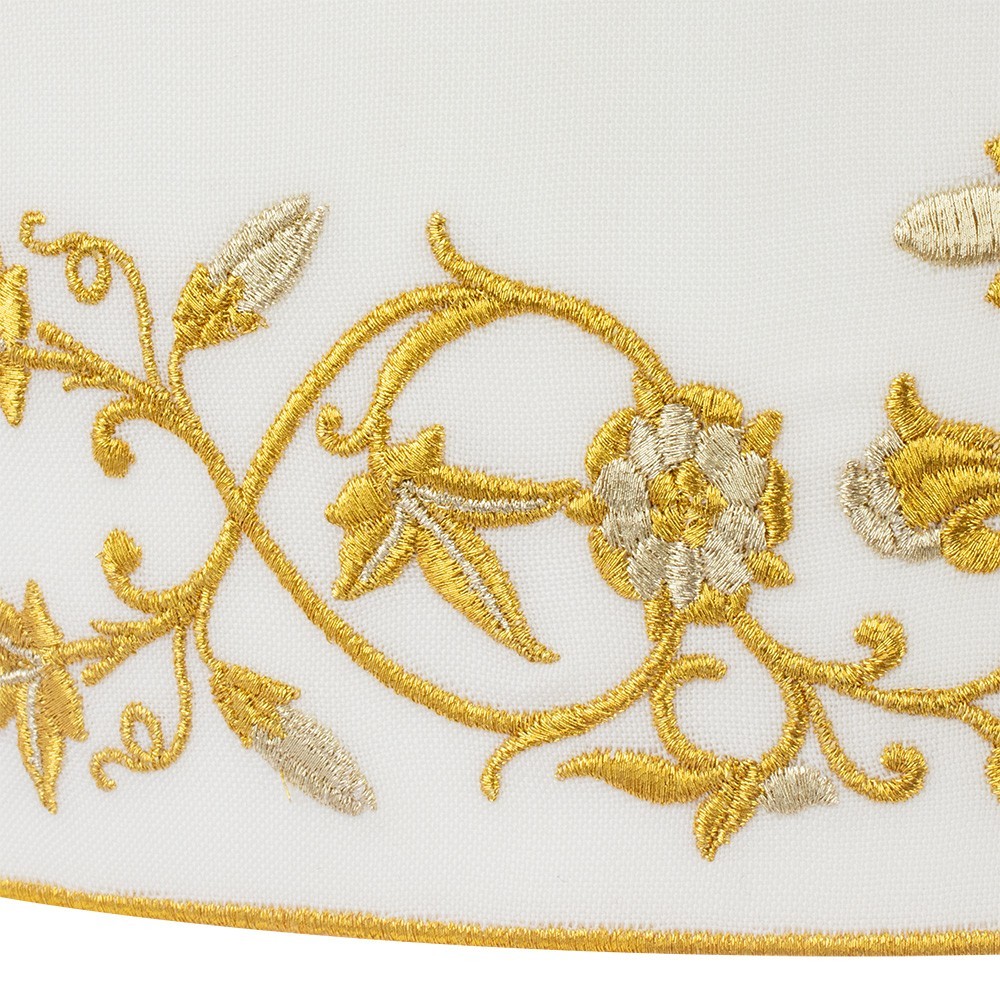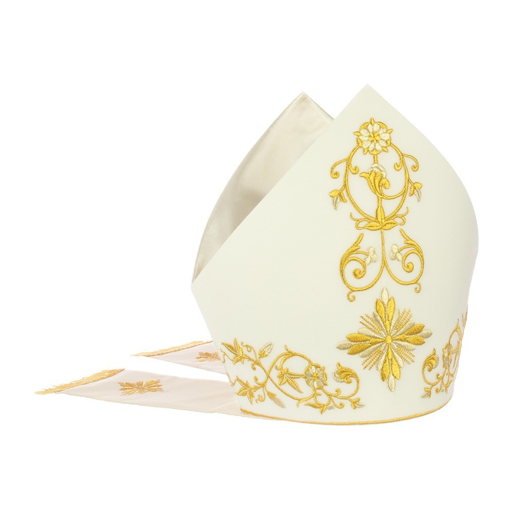 Mitre of ivory color in high quality pure wool fabric with lining. Enriched with gold machine embroidery. Complete with fringes.