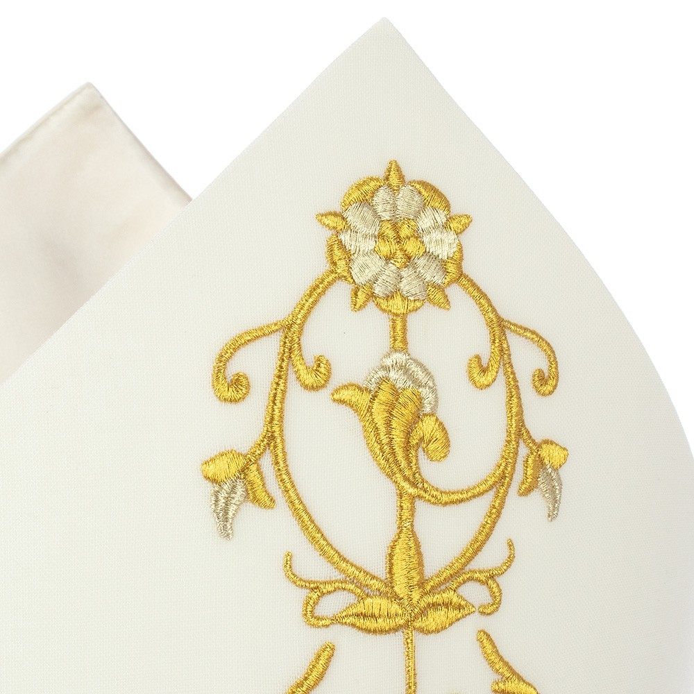 Ivory miter with gold embroidery and gold bullion fringe under the lappets. A top-quality sartorial product, 100% Made in Italy.