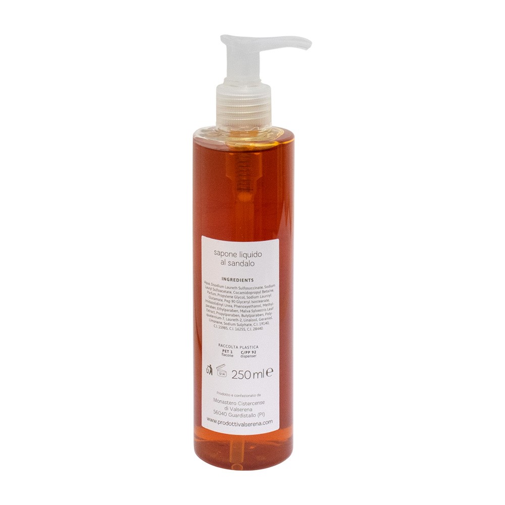 Liquid soap for delicate skin with sandalwood fragrance, handcrafted by the nuns of the Monastery of Valserena, 250 ml bottle.