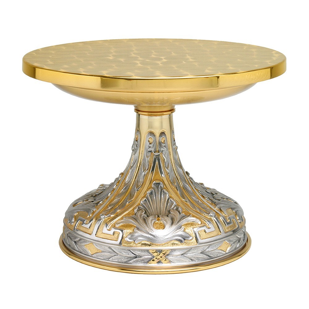 Monstrance throne in bicolor brass with gold and silver finish. The base of this elegant throne is finely decorated by and and depicts leaves and ears of wheat. Highly valuable product made by an Italian company with the greatest care and attention to detail.