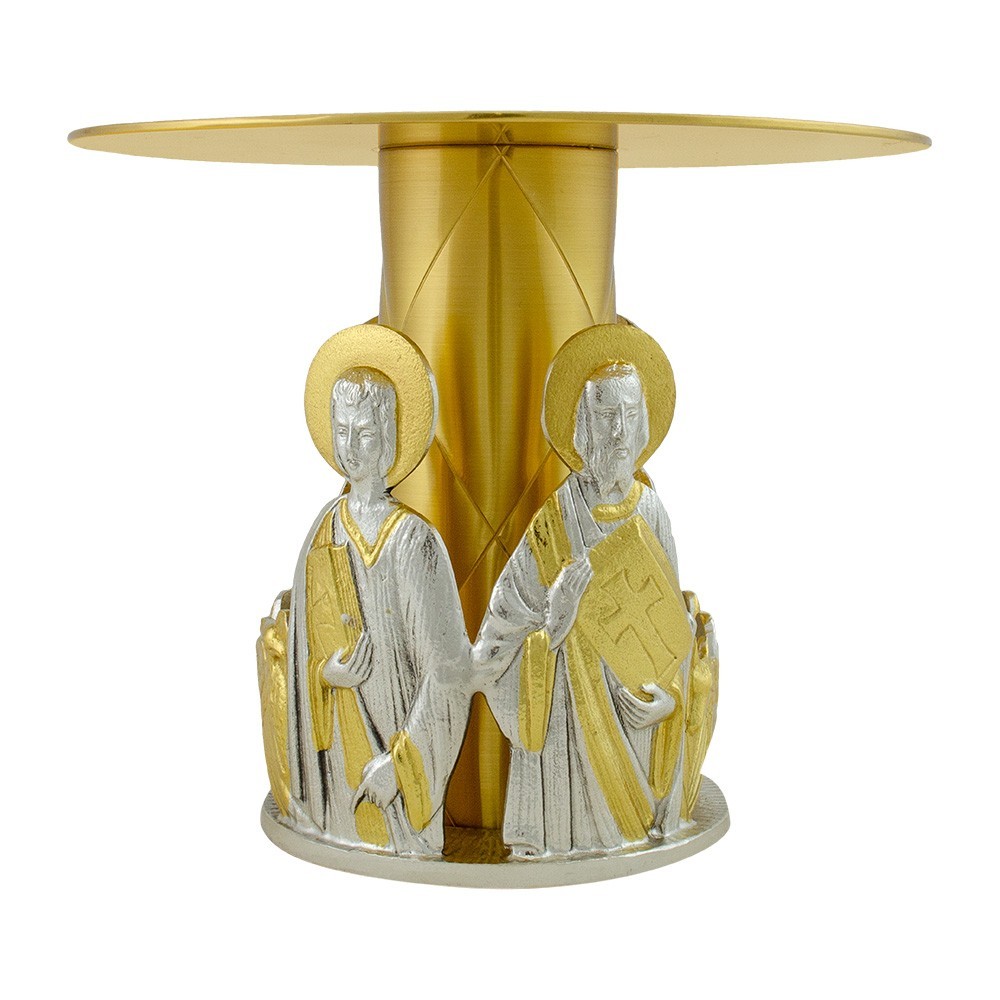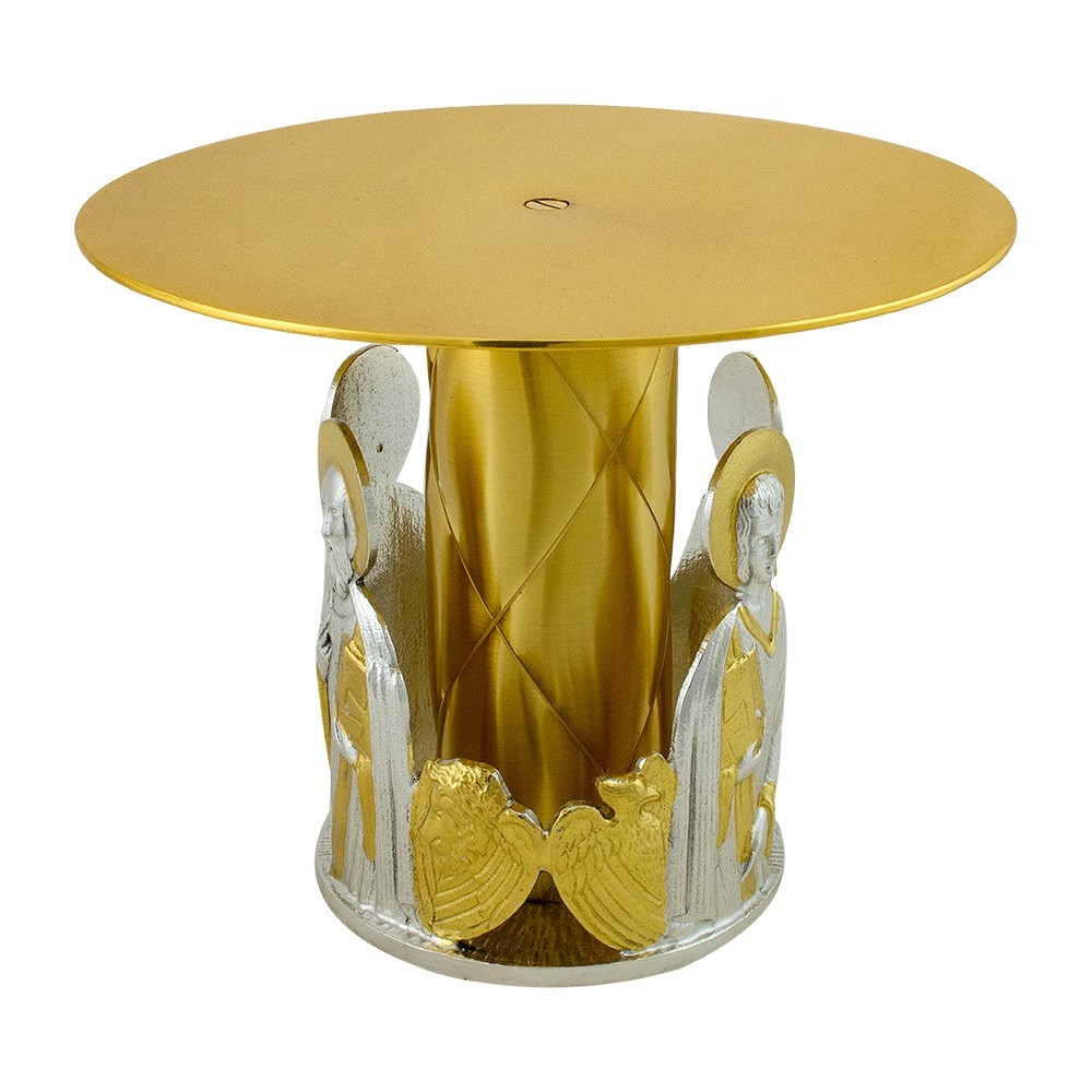 This monstrance stand is entirely made of bicolor brass and embellished with representations of the Four Evangelists.