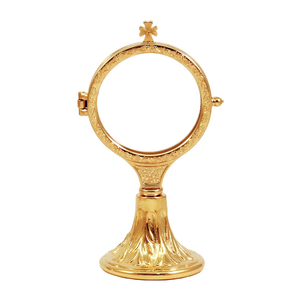 Shrine for Eucharistic adoration (h 17 cm) with short stem and decorated base. Entirely made of gold plated brass with plexiglass round window.
