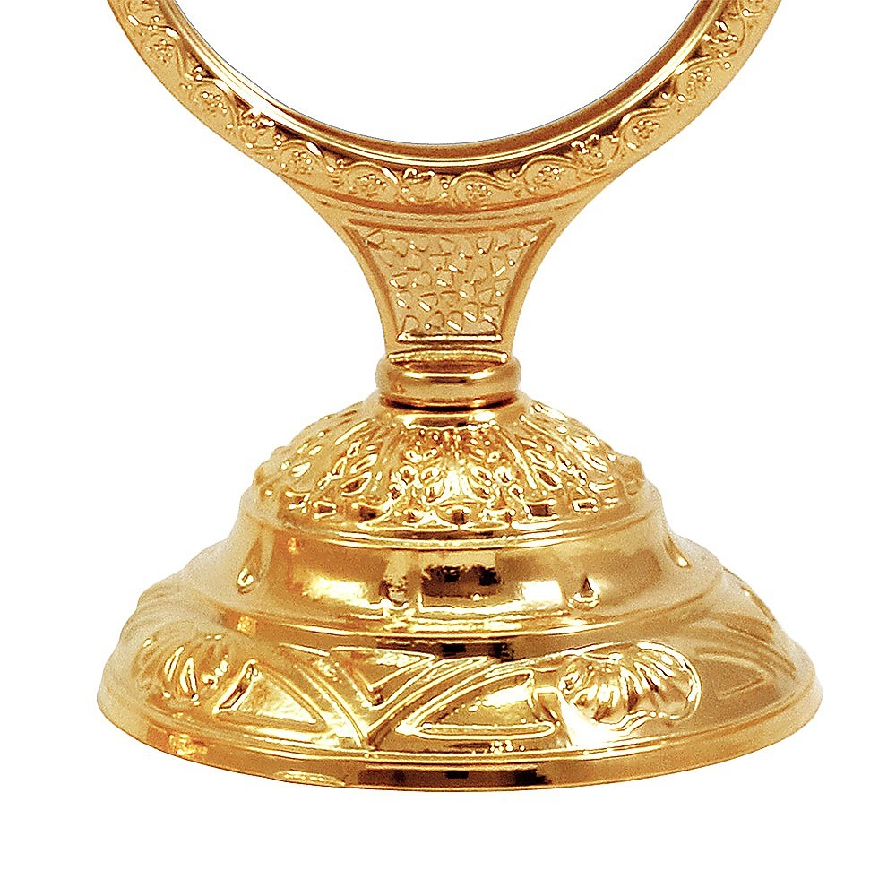 Monstrance shrine in gold-plated brass with decorated base and colored stones.