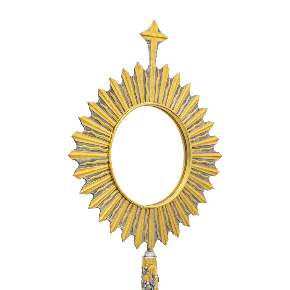 Monstrance shrine for the exposition Blessed Sacrament. Entirely made of brass with gold and silver finish. This monstrance is 68.5 cm tall and has a total diameter of 36 cm.