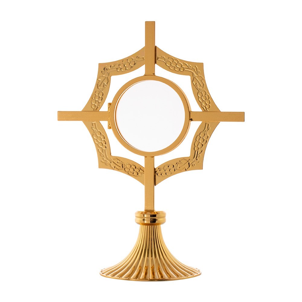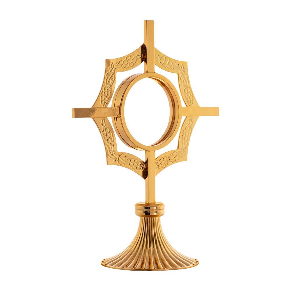 Monstrance shrine with halo made of gold-plated brass. The halo features engravings depicting “Grapes and Leaves”. Entirely made in Italy. Complete with warranty certificate.