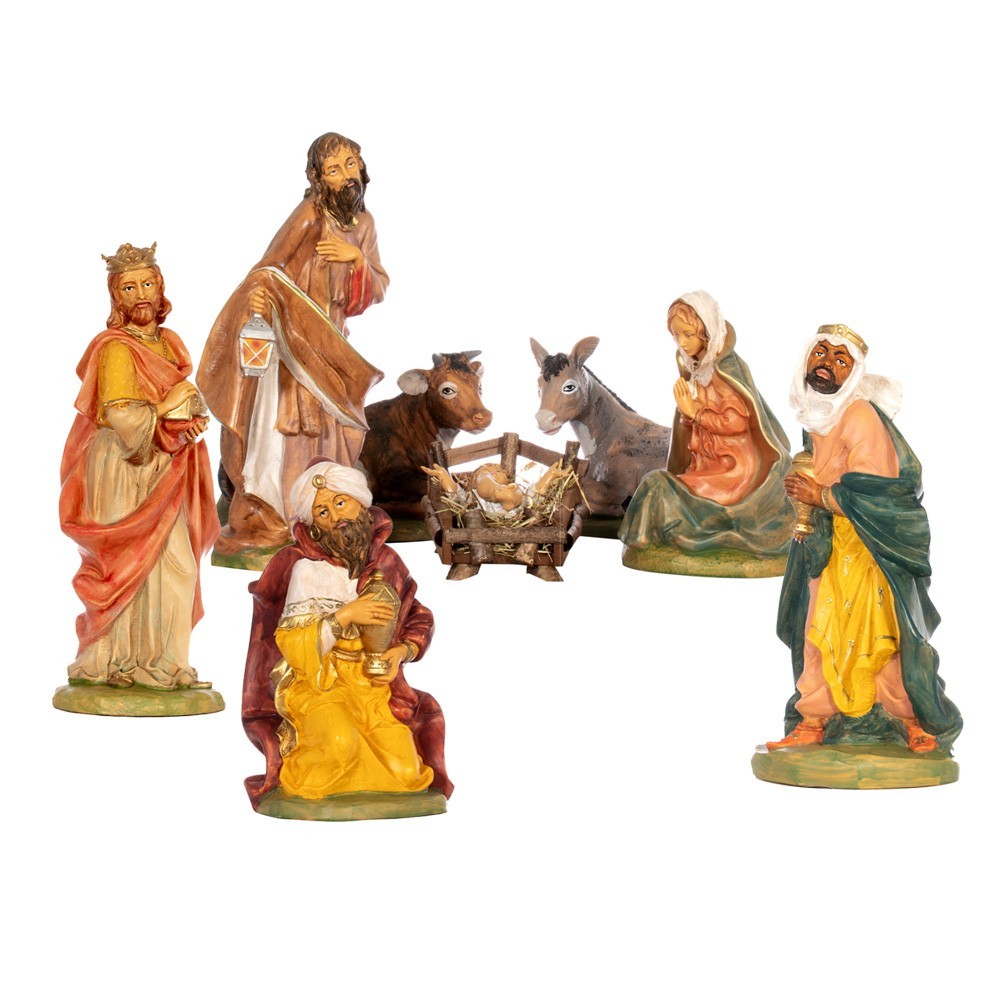 Nativity 8 figurines made of rubber. This nativity scene is composed by nativity, donkey, ox and the three kings.
