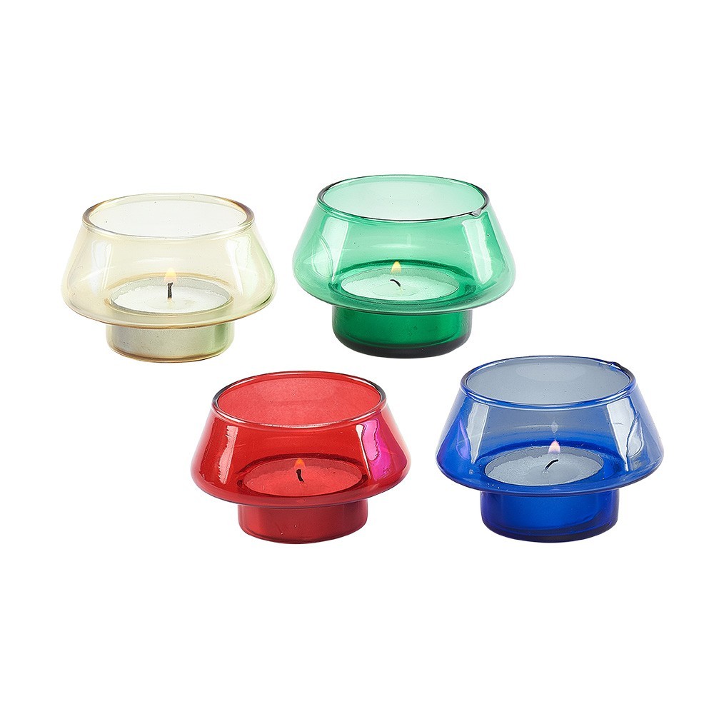 Small candle holder: colorful, windproof and floatable. Made of colorful glass, complete with wax tea light. Available in different assorted colors.