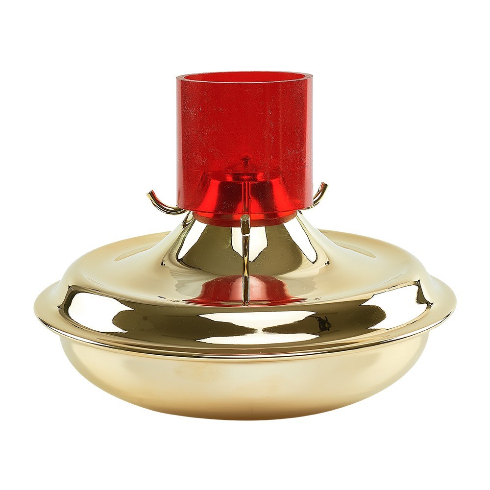 Red liquid wax lamp with brass base. Size: 16x21 cm.