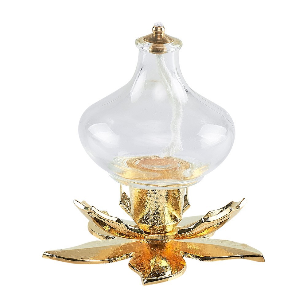 Small onion lamp on a golden brass base shaped like a lotus flower. Complete with wick and wick holder.