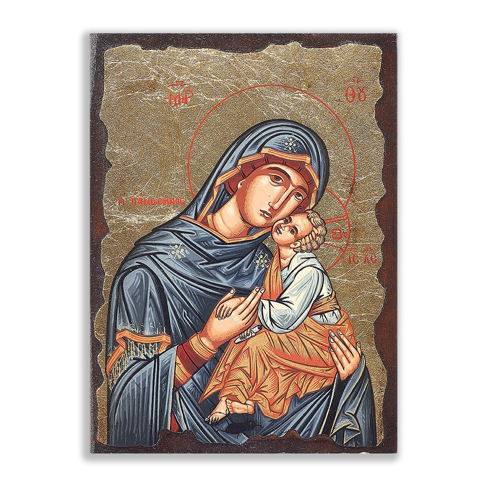 Holy icon depicting the Virgin Mary with child. The icon is made using the screen printing technique (indented image) on gold leaf. It is 15 cm tall and 11 cm wide.