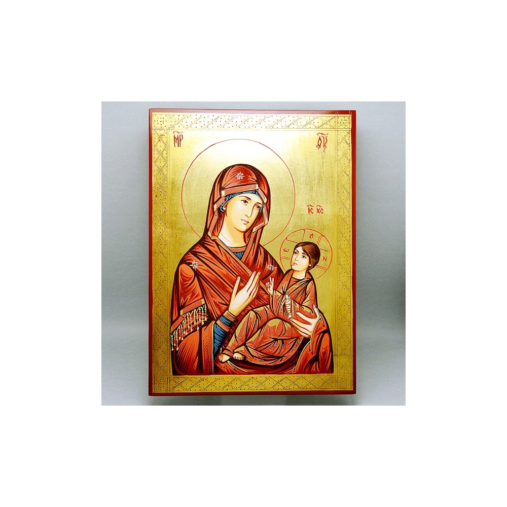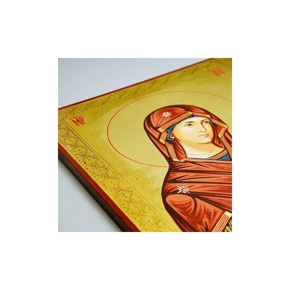 Romanian icon depicting the Virgin of Tenderness, handpainted with gold leaf. Made in accordance with the iconography technique on solid wood. Supplied with certificate of authenticity applied on the back and blue velvet box.