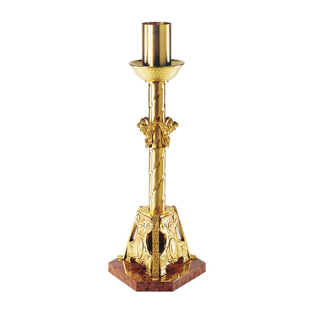 Paschal candle stand in brass and marble with risen Christ decoration.