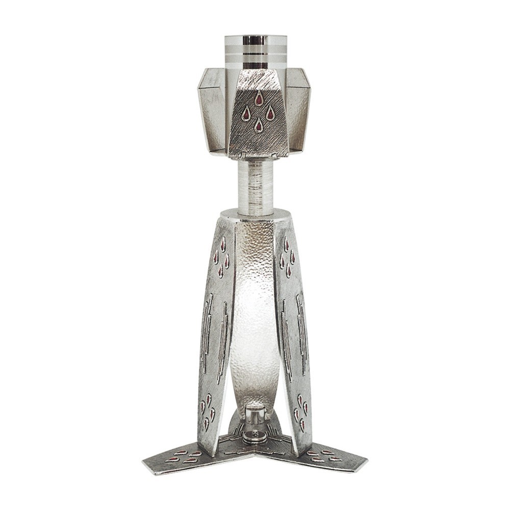 Candle holder in silver-plated brass with red enamels, h 50 cm.