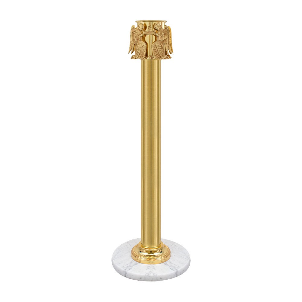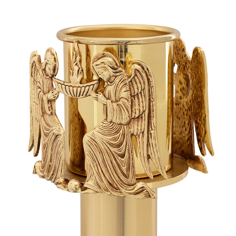Paschal candle stand with Angels. Entirely made of gold-plated brass. This stand features decorations (made using the casting technique) in the upper part and on the circular marble base.