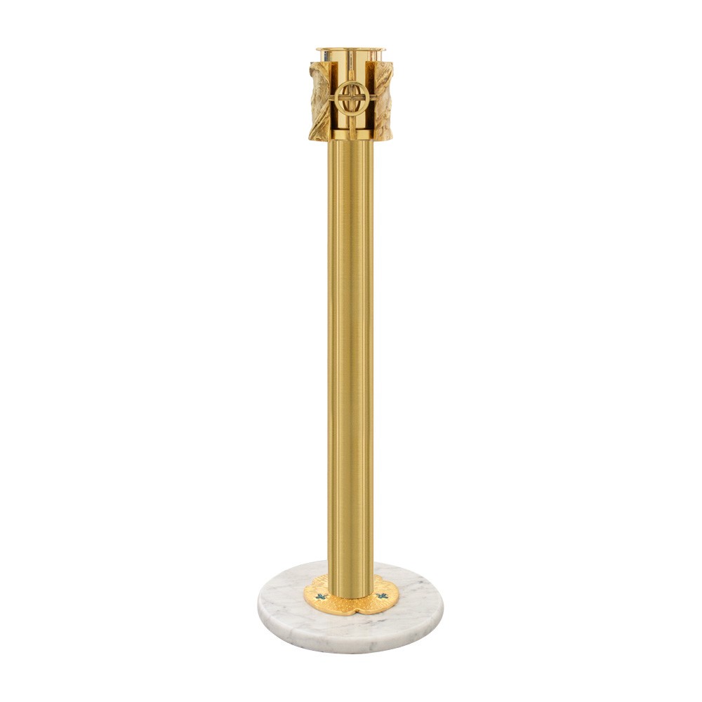 Paschal candle stand in brass and marble with risen Christ decoration.