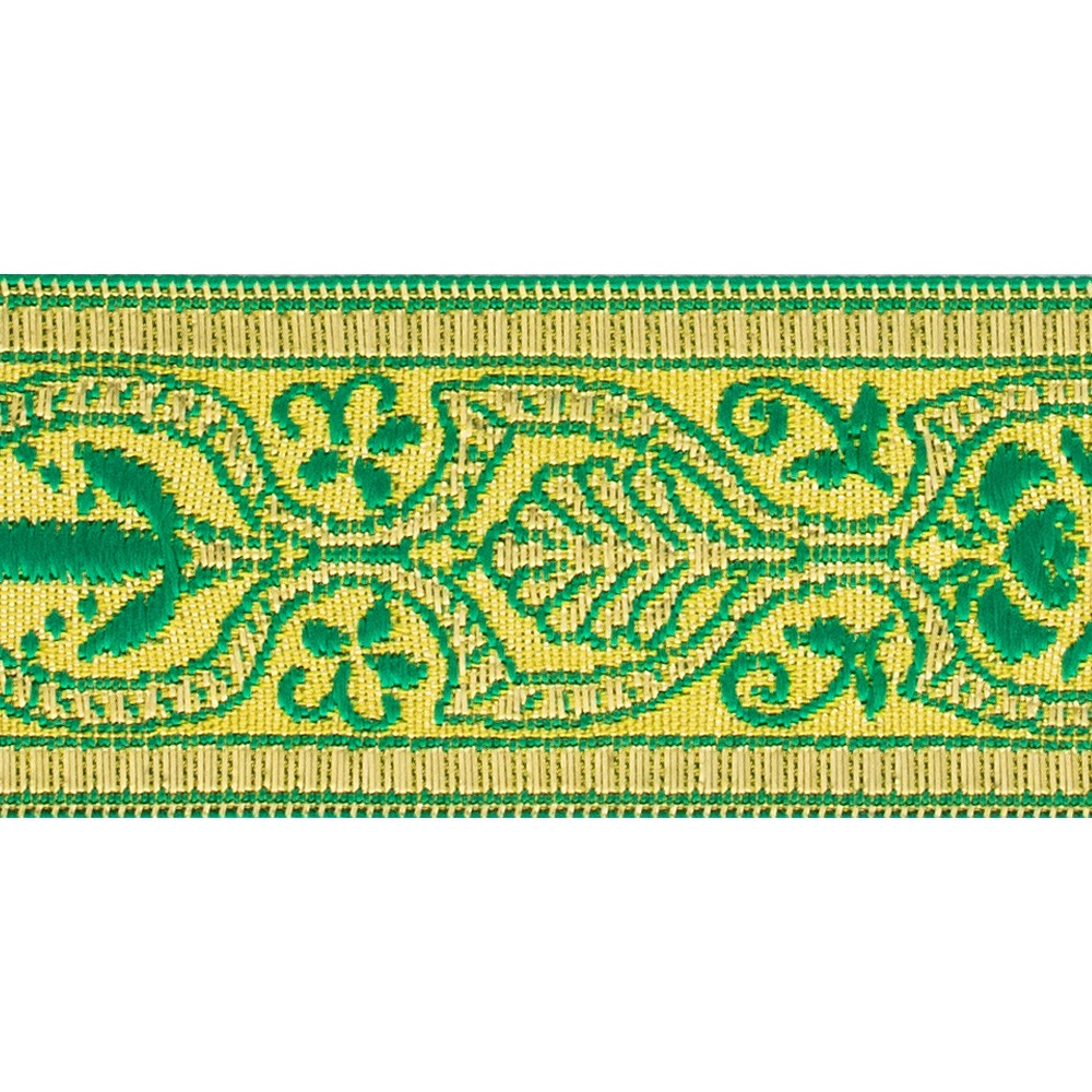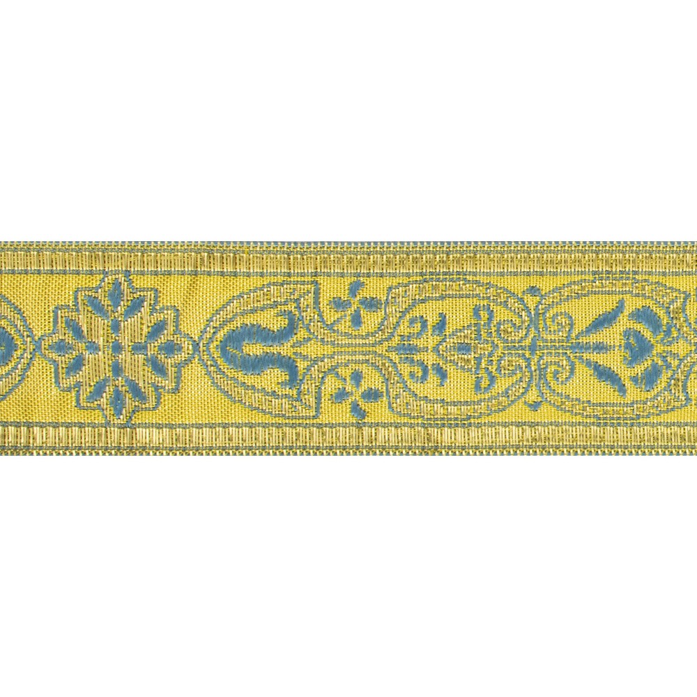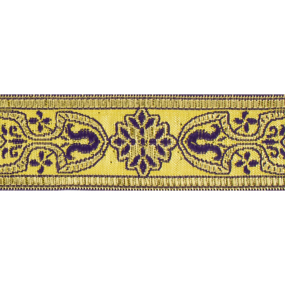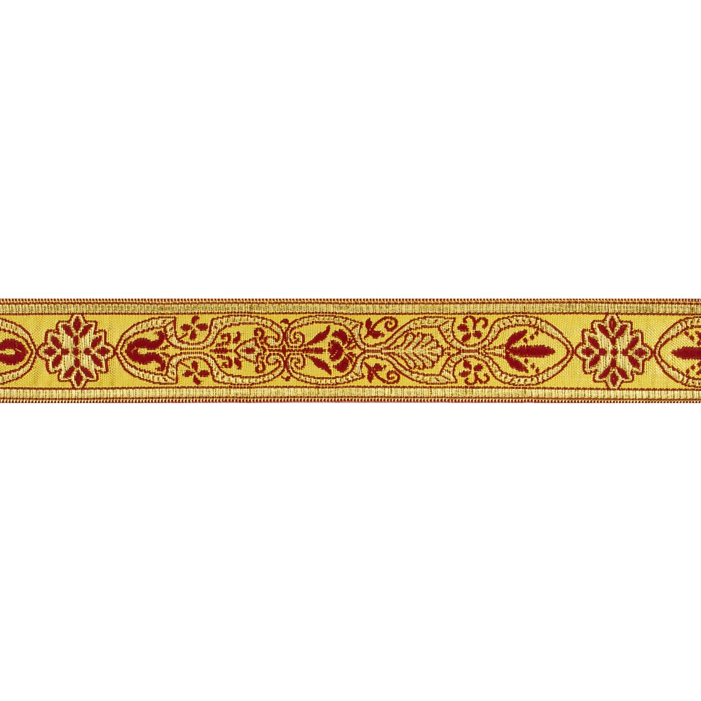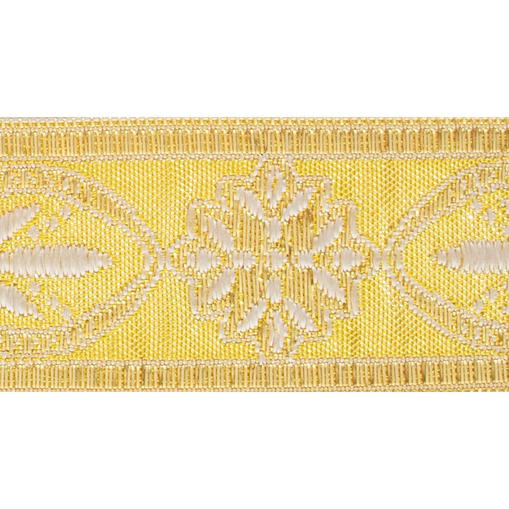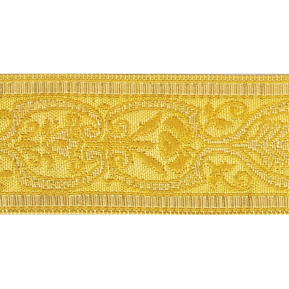 Gold-colored trim available in various height sizes. Ideal for sewing and decorating liturgical vestments.