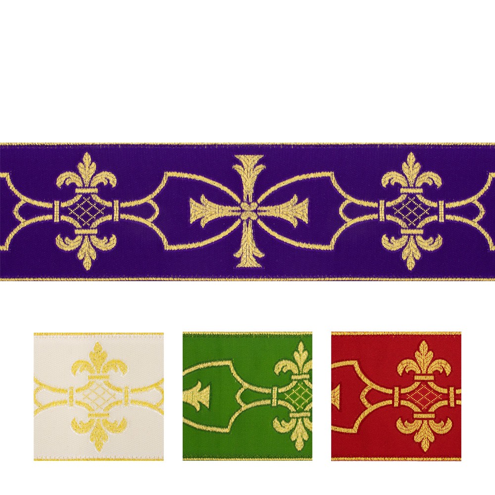 Embroidered galloon suitable for chasubles and liturgical vestments, available in four liturgical colors.