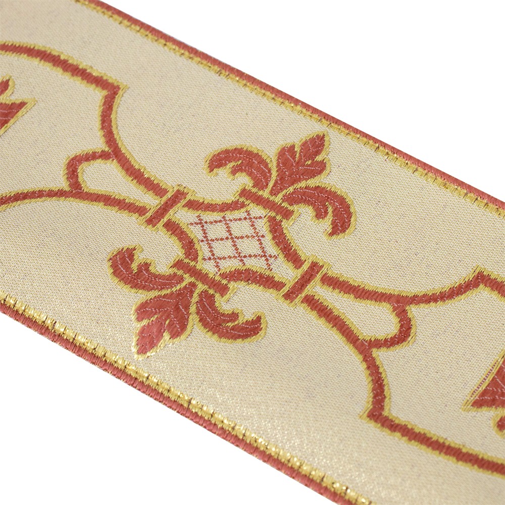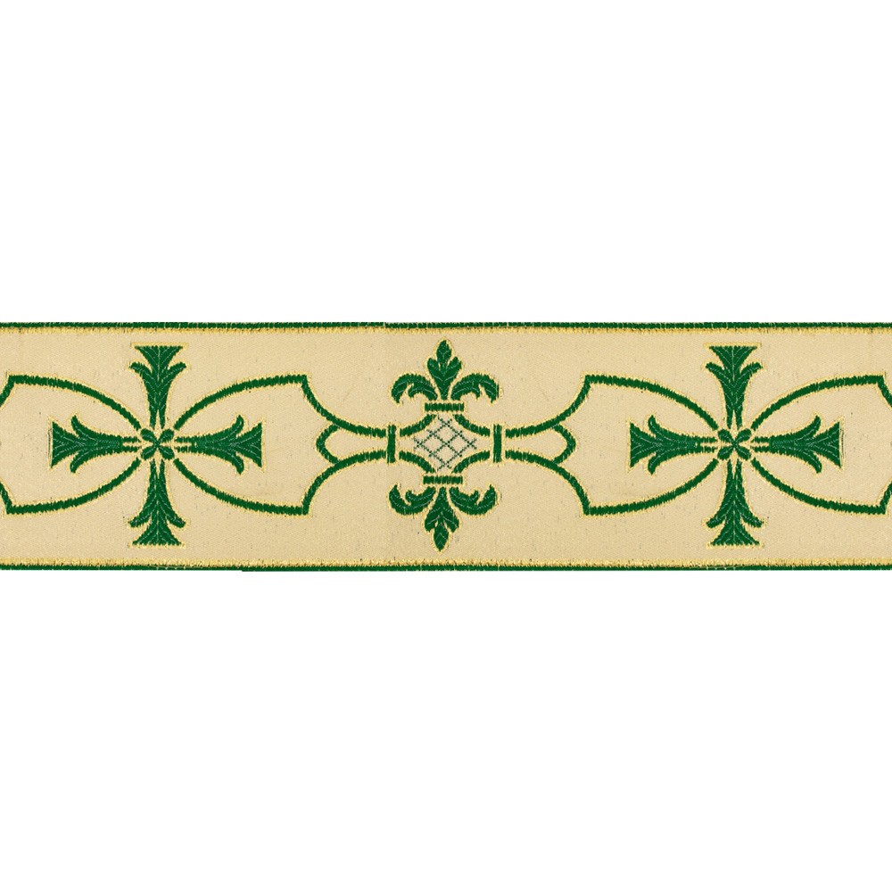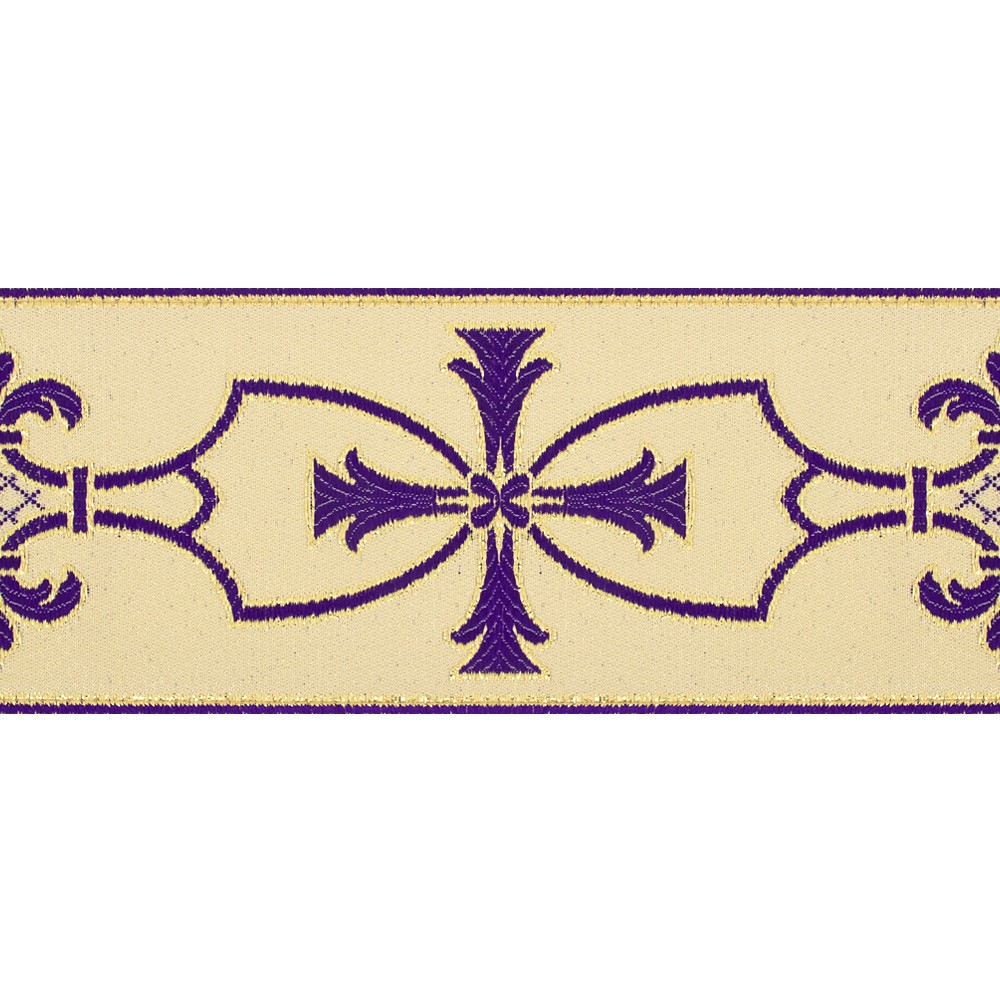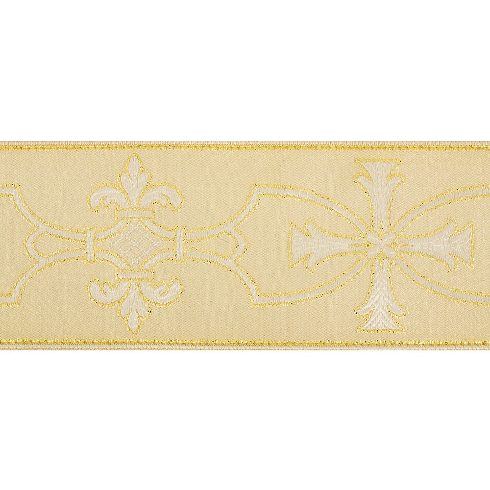 This galloon is finely embroidered with “amphora cross” motif on white background and is made of excellent quality and resistant fabric blend of polyester and acetate.