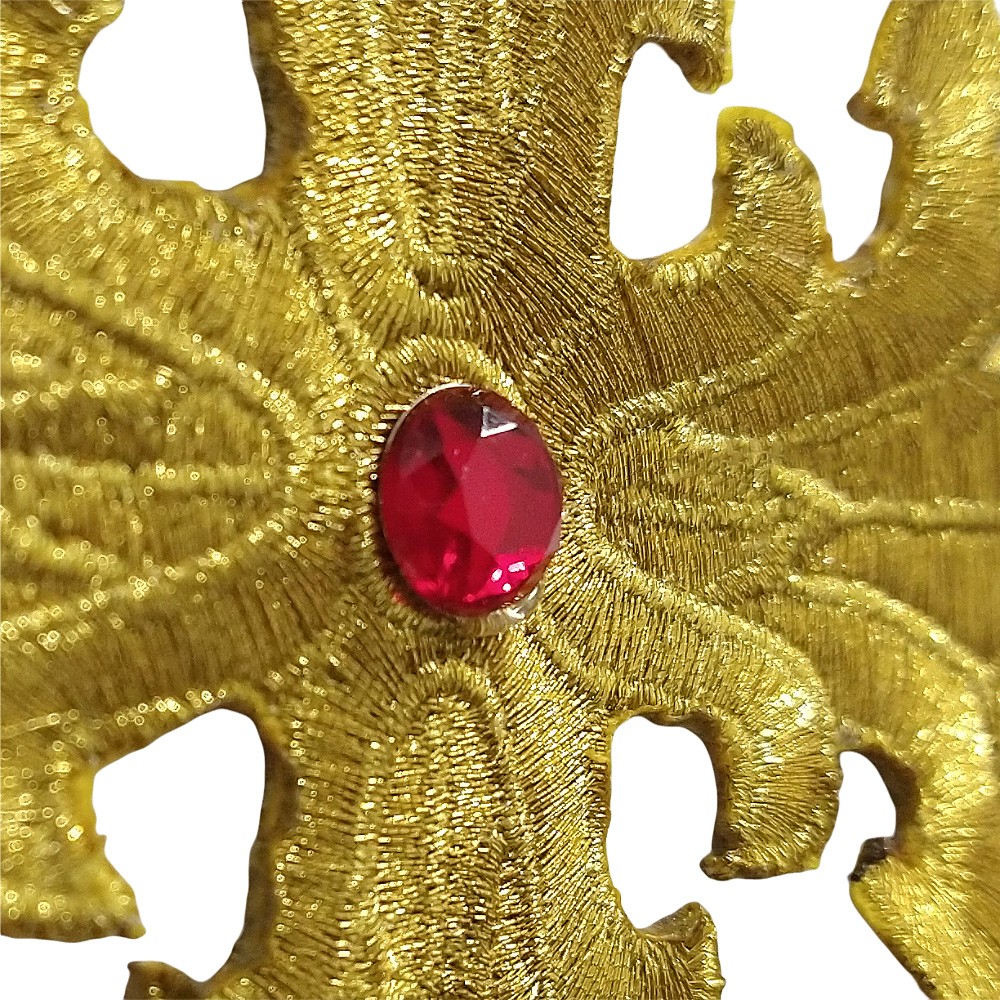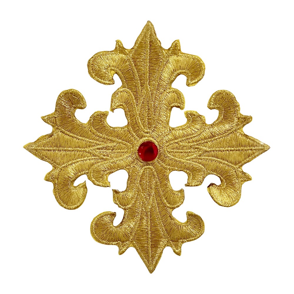 Cross patch embroidered with golden thread, embellished by a round stone in the middle.