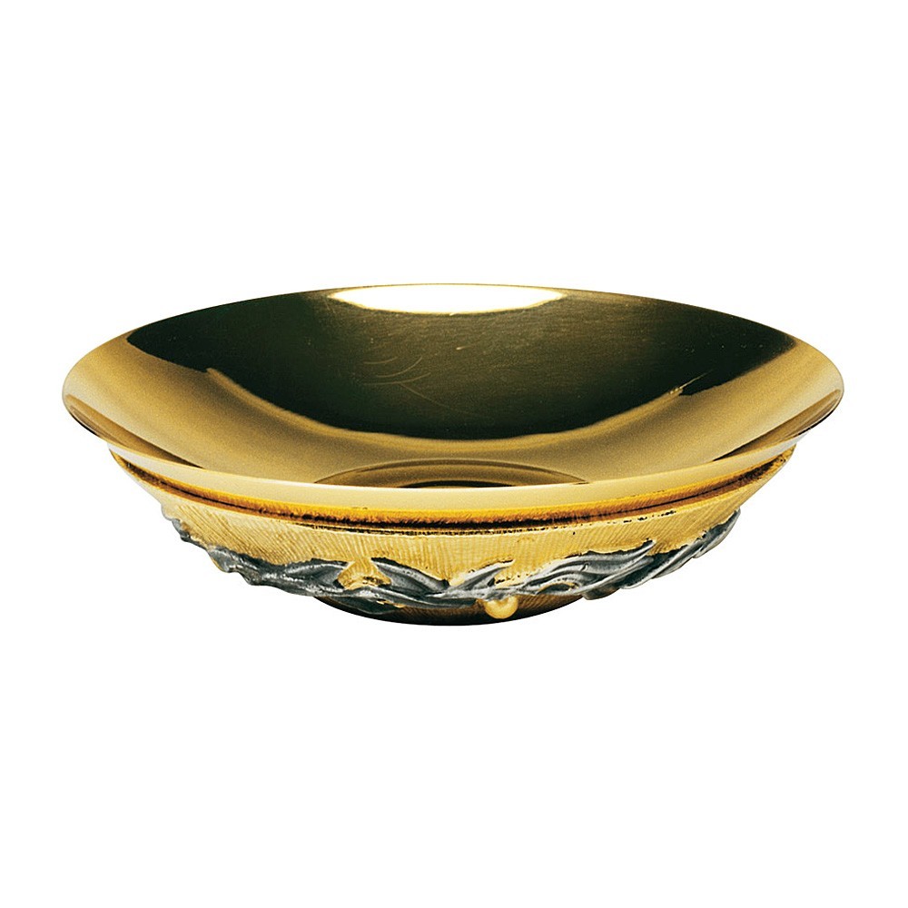 Offertory paten made of two-tone brass, embellished by bas-relief decoration. Made in Italy.