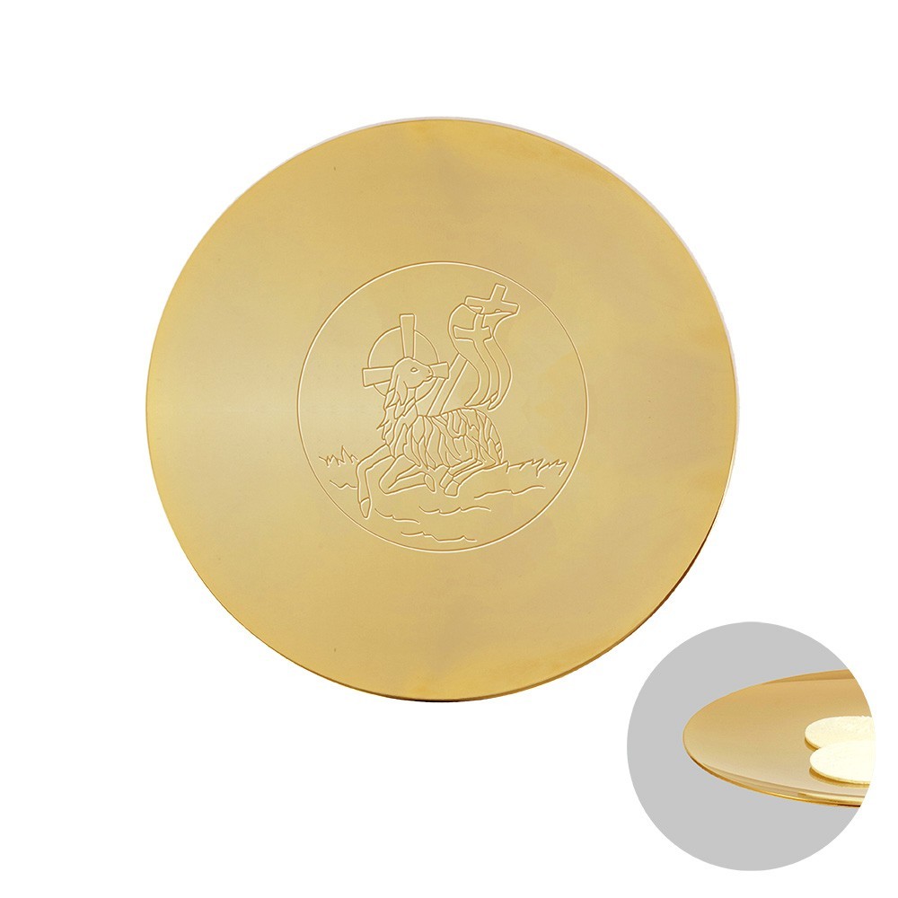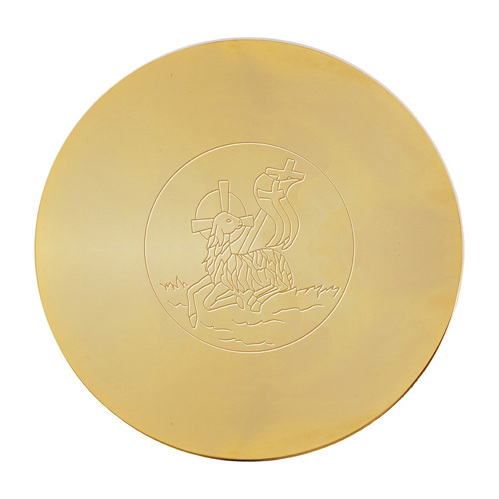 Paten in 24k golden brass with engraving depicting the Lamb of Peace.