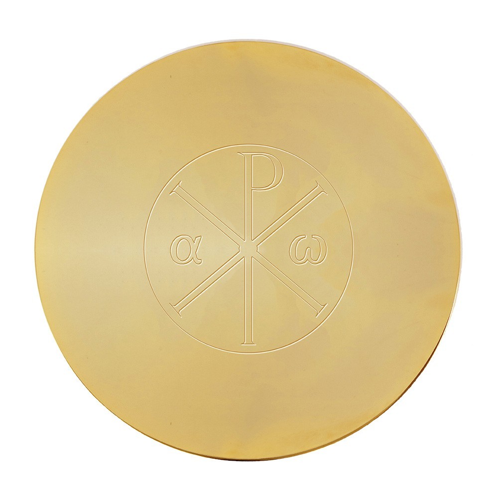 Paten made of brass with 24k gilding and engraving depicting Alpha and Omega symbols.