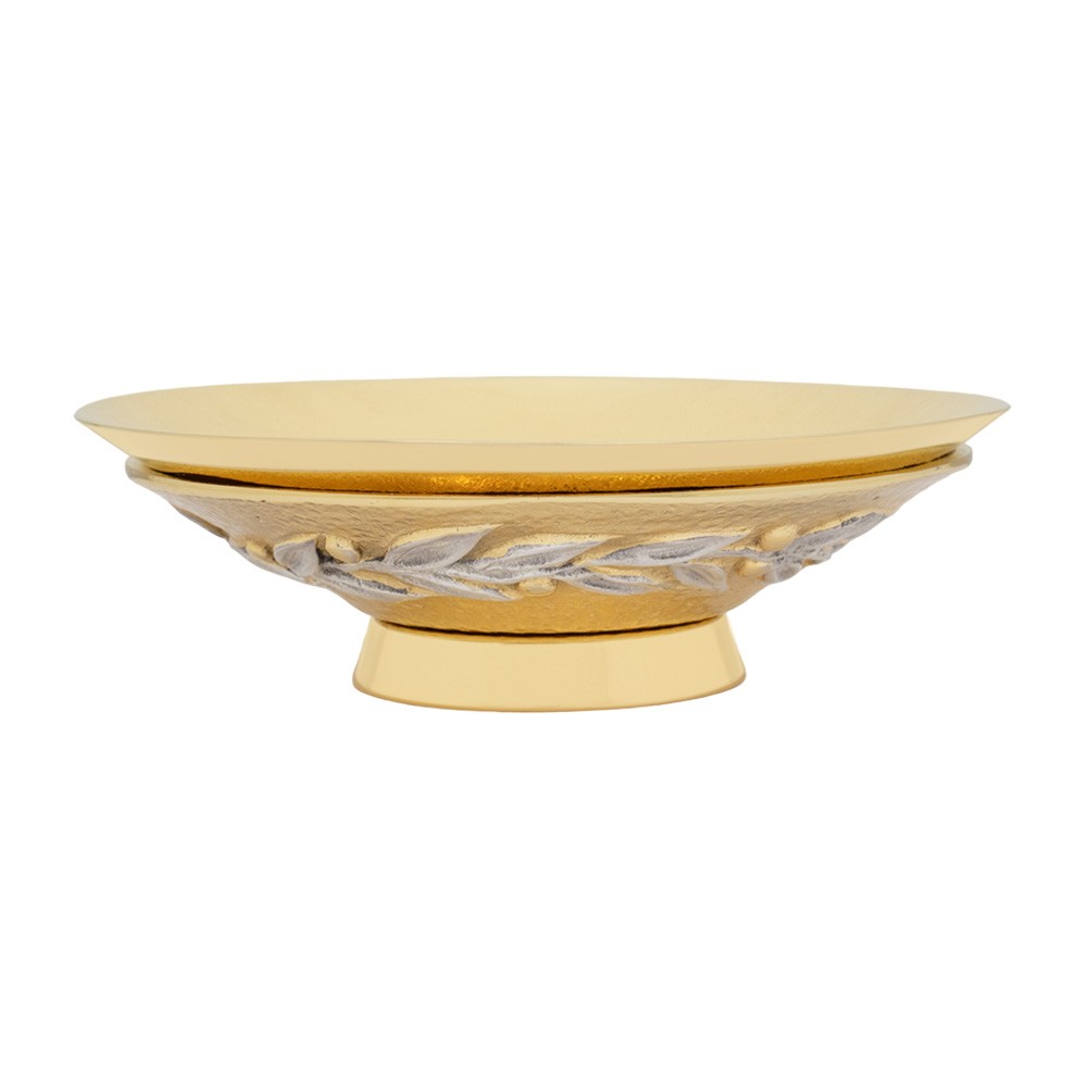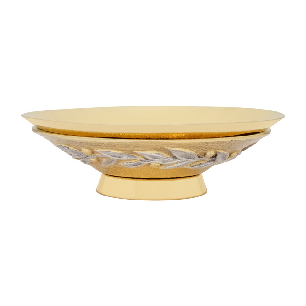 Offering plate in gold-plated brass with silver ornaments in relief.