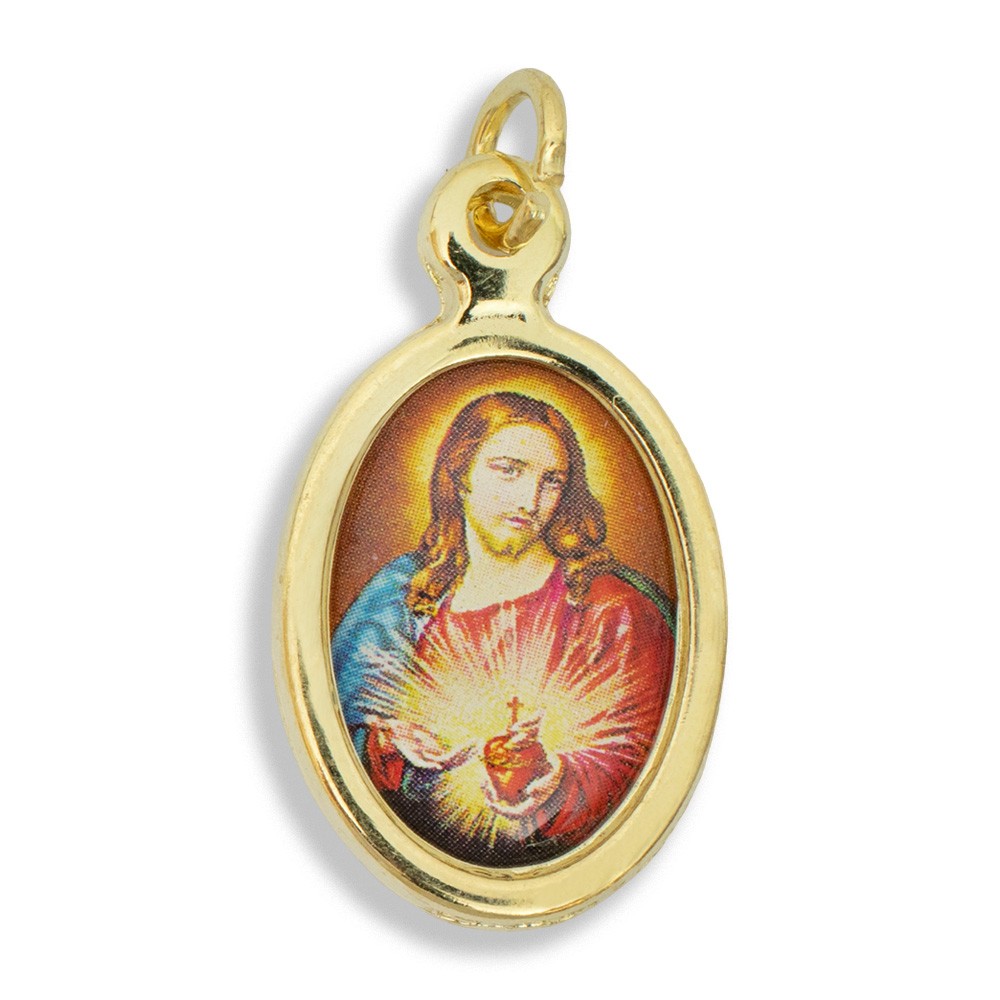Oval medal in gilded metal with image depicting the Sacred Heart of Jesus.