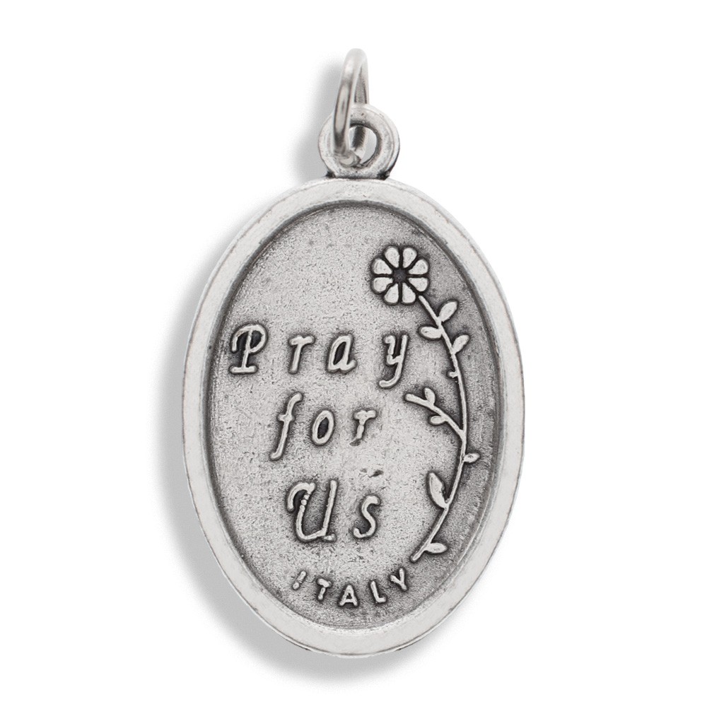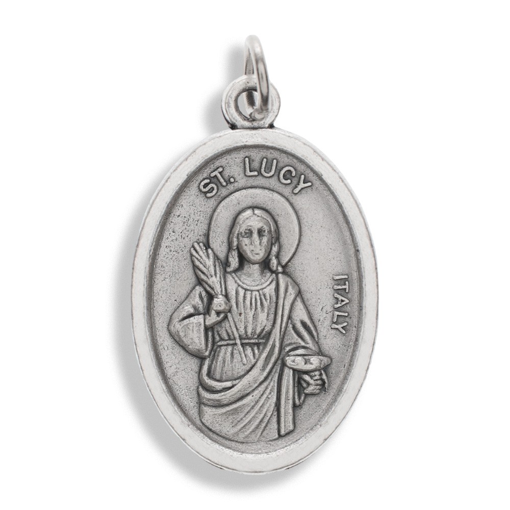 Medal of Saint Lucy in oxidized silver metal. The front depicts the Saint, whereas the back features the inscription “PRAY FOR US”.