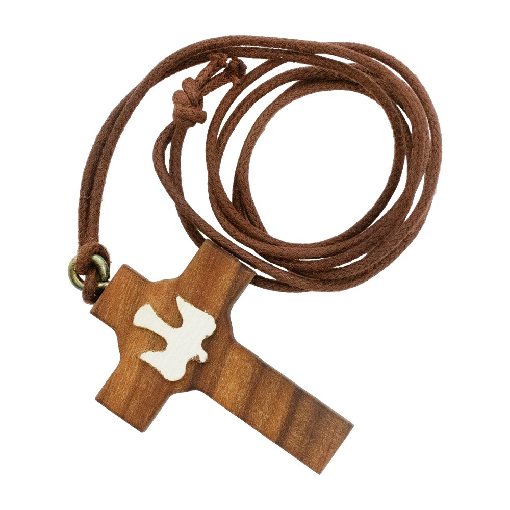 This wooden pendant cross features a white dove in relief and comes complete with a brown cord for wearing.