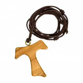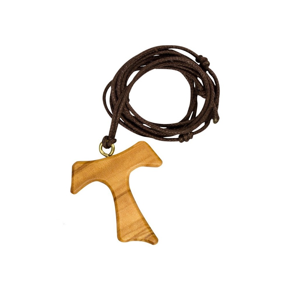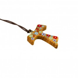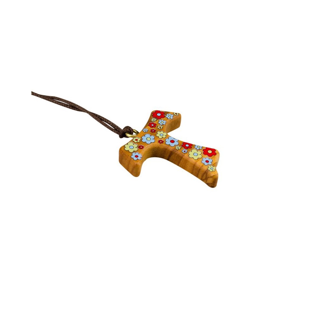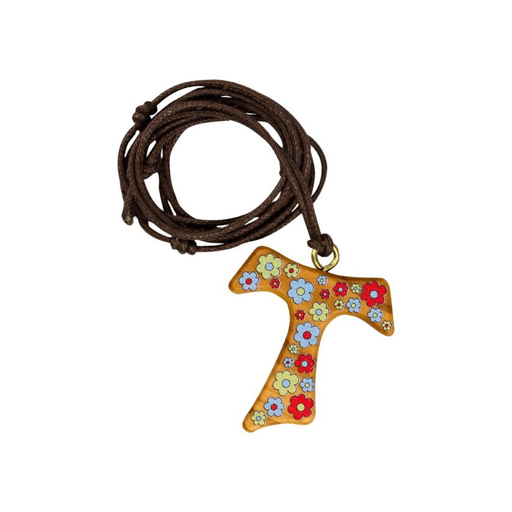 Tau Cross Pendant in Wood with Flowers. The pendant is made of olive wood and decorated with flowers; complete with eyelet in golden brass and a brown rope string.
