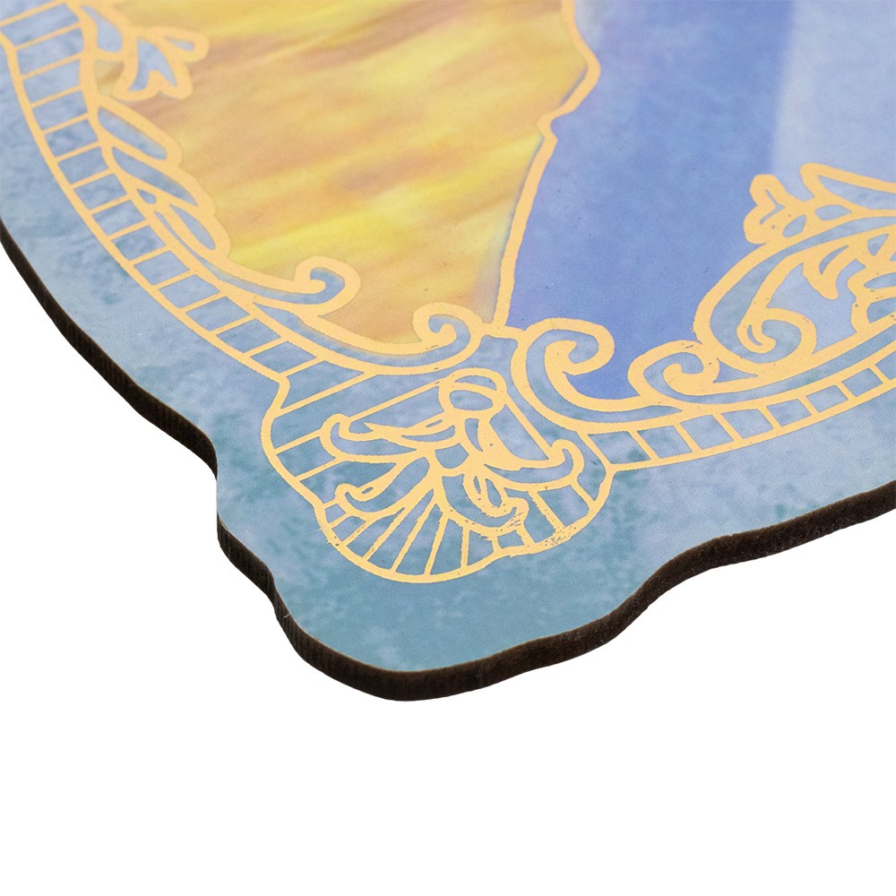 The frame is shaped from MDF wood fiber and adorned with golden decorations.