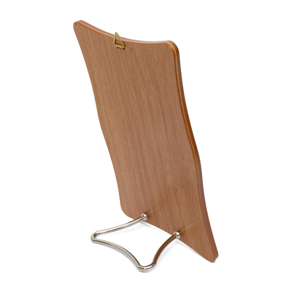 The plaque is approximately 15 cm in height and 9.5 cm in width, complete with a metal triangle for hanging and a stand for display.