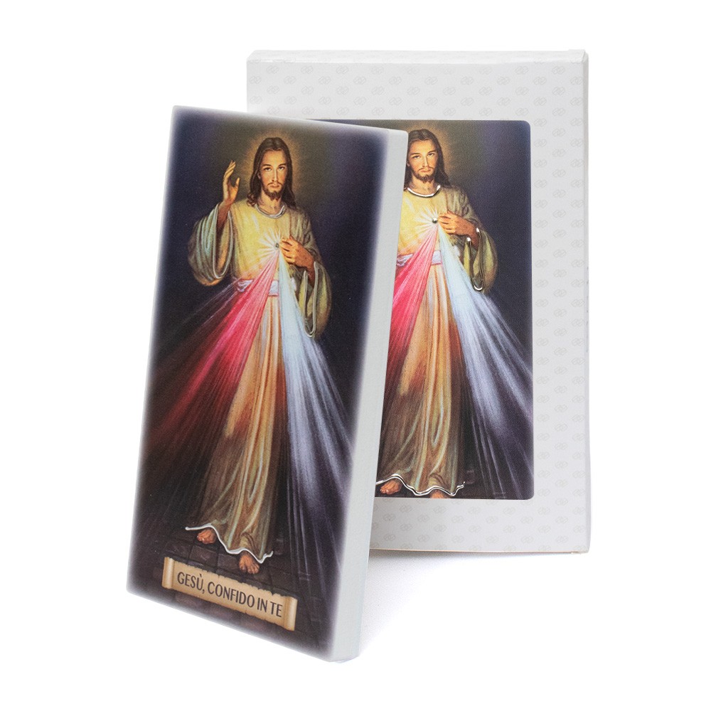 Divine Mercy image of Jesus on MDF wood plaque with silver-tone metal accents, size 9.2 x 17.5 cm.