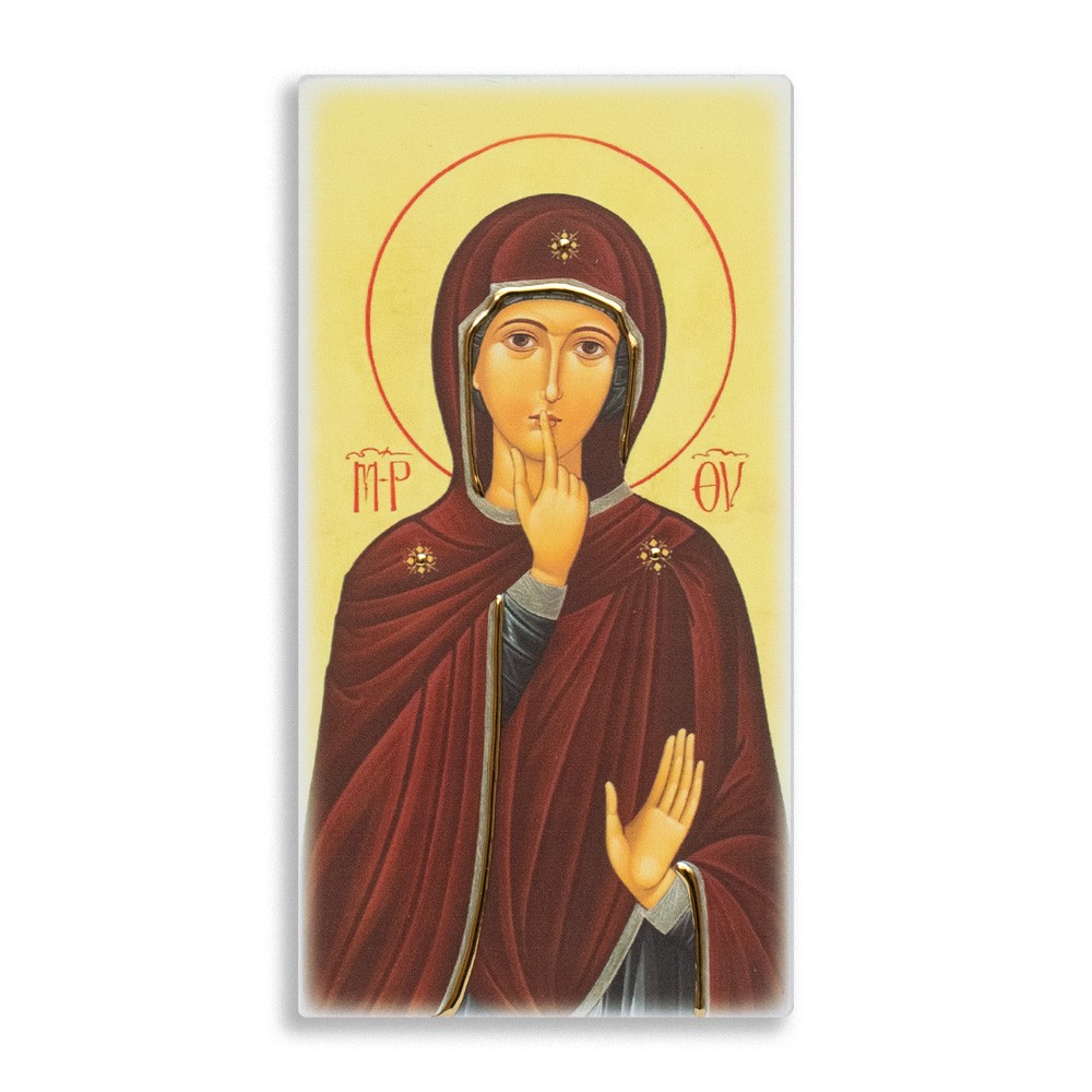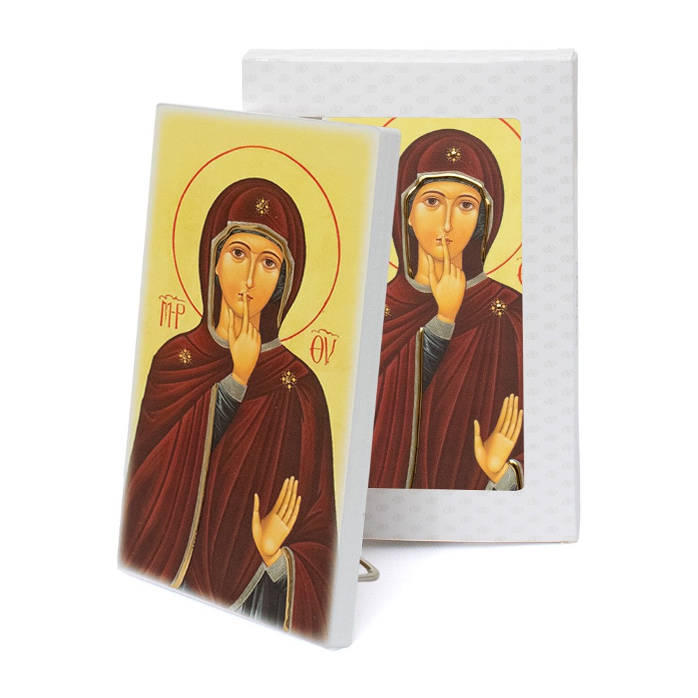 An elegant plaque featuring the Madonna of Silence, crafted on a white MDF wood panel with high-quality digital printing. It is enhanced with hand-crafted gold-plated metal accents, which highlight its beauty. The plaque includes a metal stand for display and a hole on the back for hanging.