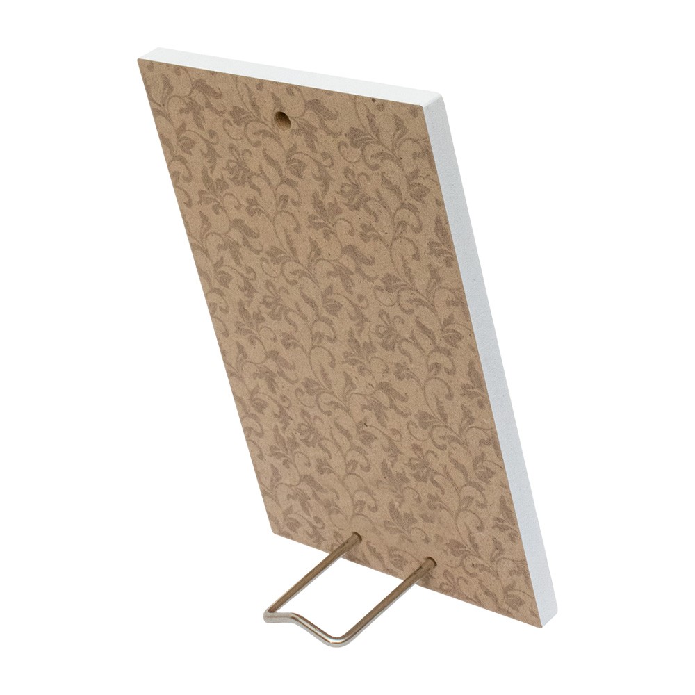 Equipped with a metal stand for tabletop display and a hole on the back for wall mounting.