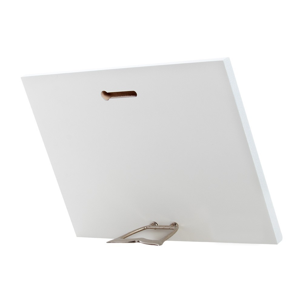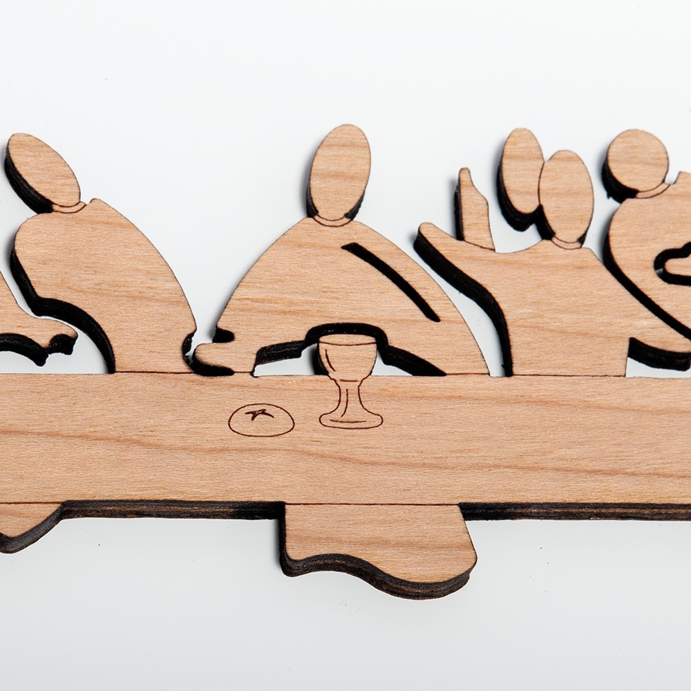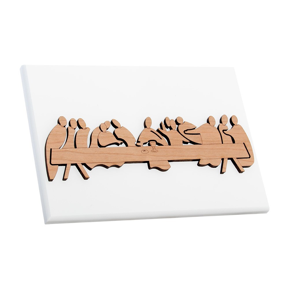 Modern style picture made of white lacquered wood with laser carved image. The image on the white board is created with laser and depicts the Last Supper. Equipped with hole and metal support foot in order to hang it or place it on a surface. Elegant item of excellent quality, handcrafted with care to every detail.