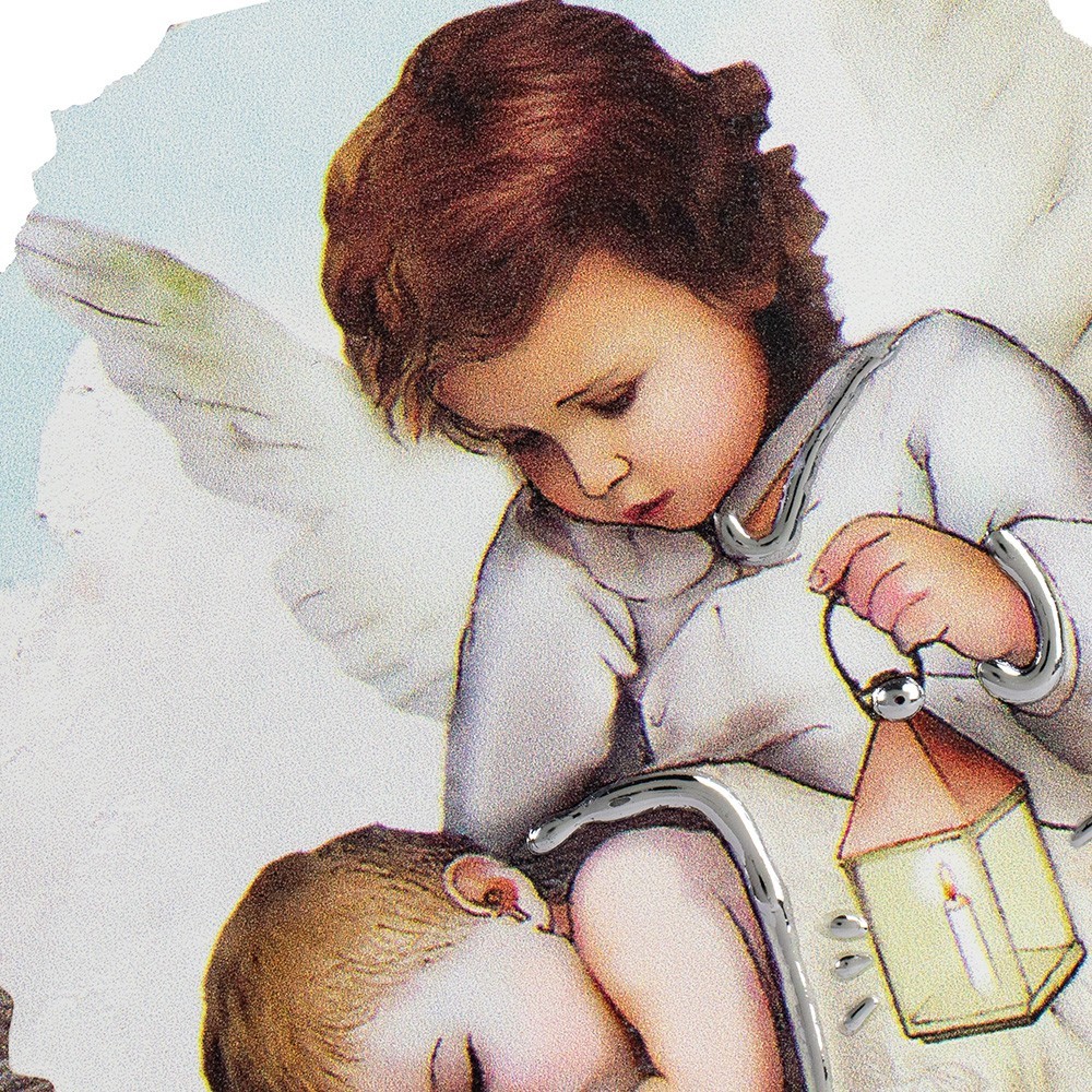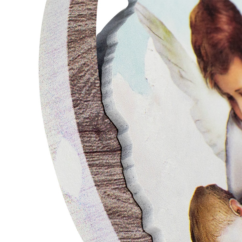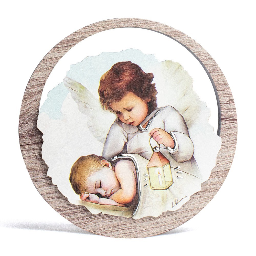 Round picture of the Guardian Angel. Made of wood with very light sky blue bottom and image depicting the Guardian Angel enriched with ornaments in laminated silver.